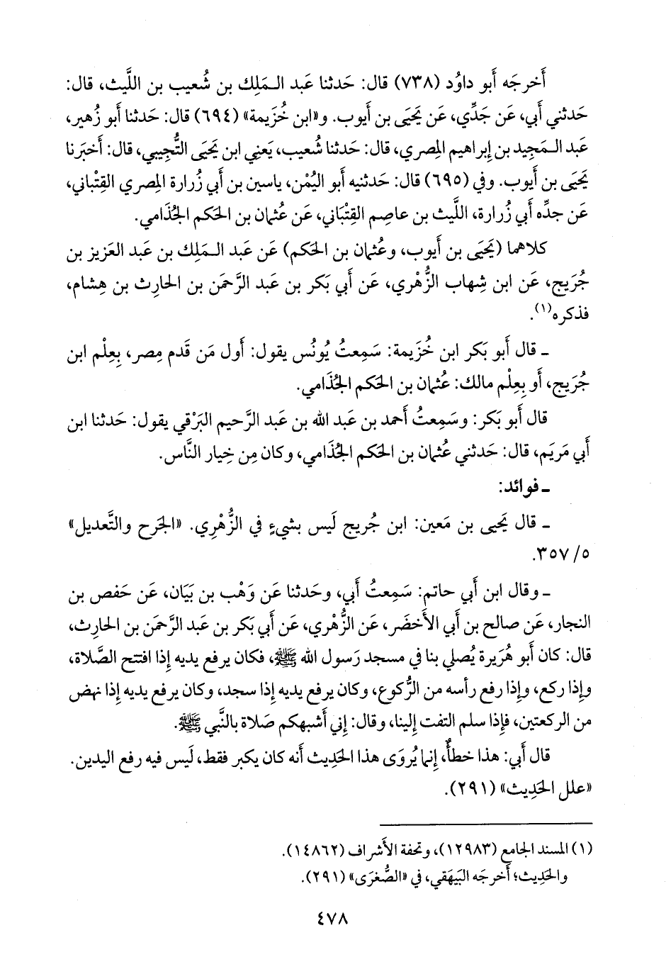 وخالفه يحيى بن أيوب، وعثمان بن الحكم الجذامي، فروياه عن ابن جُريج، عن الزُّهْري، عن أَبي بكر بن عبد الرَّحمَن، عن أبي هريرة؛ كان رسول الله صَلى الله عَليه وسَلم إذا افتتح الصلاة كبر ورفع يديه حذو منكبيه، وإذا أراد الركوع رفعهما، وإذا رفع رأسه من الركوع رفعهما، وإذا قام من الركعة الثالثة بعد التشهد.