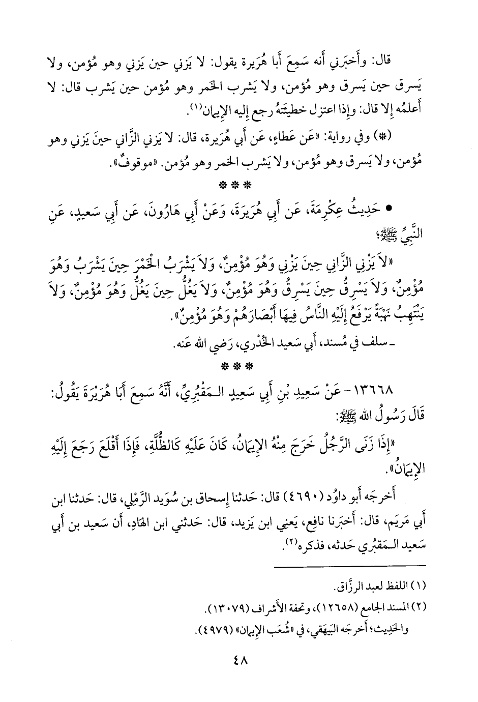 «لا يزني الزاني حين يزني وهو مؤمن، ولا يشرب الخمر حين يشرب وهو مؤمن، ولا يسرق حين يسرق وهو مؤمن، ولا يغل حين يغل وهو مؤمن، ولا ينتهب نهبة يرفع إليه الناس فيها أبصارهم وهو مؤمن».