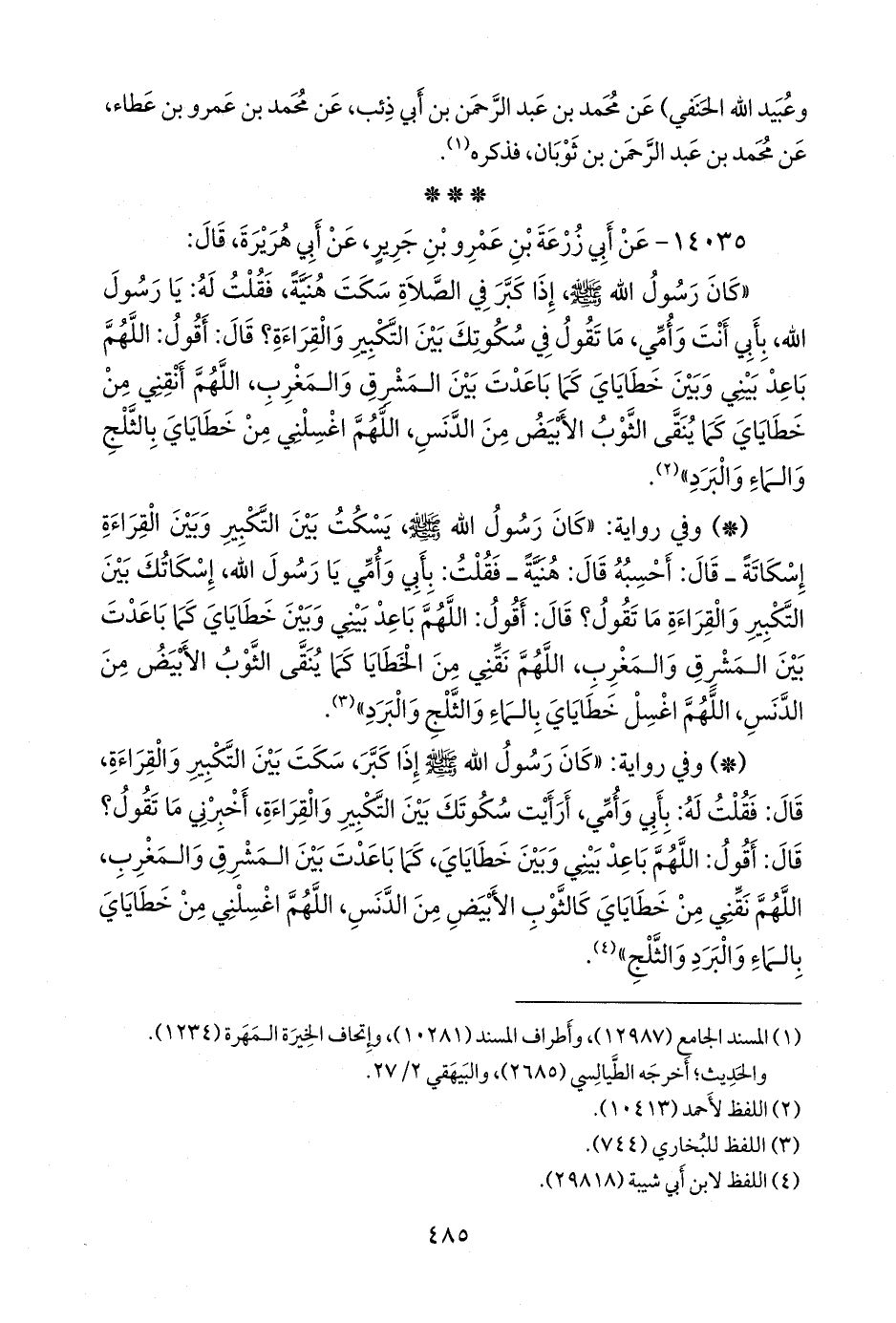 - وفي رواية: «كان رسول الله صَلى الله عَليه وسَلم يسكت بين التكبير وبين القراءة إسكاتة ـ قال: أحسبه قال: هنية ـ فقلت: بأبي وأمي يا رسول الله، إسكاتك بين التكبير والقراءة ما تقول؟ قال: أقول: اللهم باعد بيني وبين خطاياي كما باعدت بين المشرق والمغرب، اللهم نقني من الخطايا كما ينقى الثوب الأبيض من الدنس، اللهم اغسل خطاياي بالماء والثلج والبرد» (¬٢).