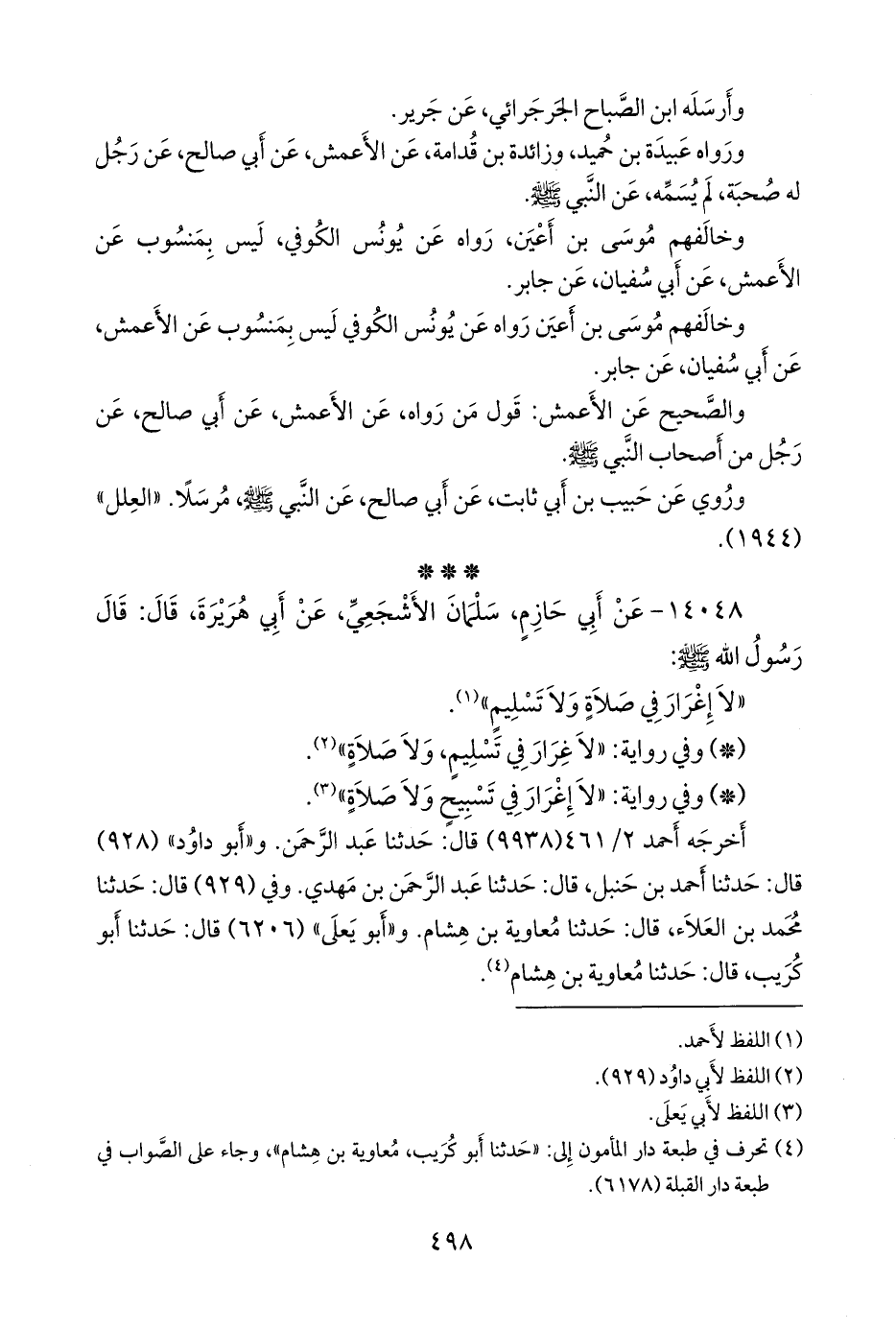 أخرجه أحمد (٩٩٣٨) قال: حدثنا عبد الرَّحمَن. و «أَبو داود» (٩٢٨) قال: حدثنا أحمد بن حنبل، قال: حدثنا عبد الرَّحمَن بن مهدي. وفي (٩٢٩) قال: حدثنا محمد بن العلاء، قال: حدثنا معاوية بن هشام. و «أَبو يَعلى» (٦٢٠٦) قال: حدثنا أَبو كُريب، قال: حدثنا معاوية بن هشام (¬٤)