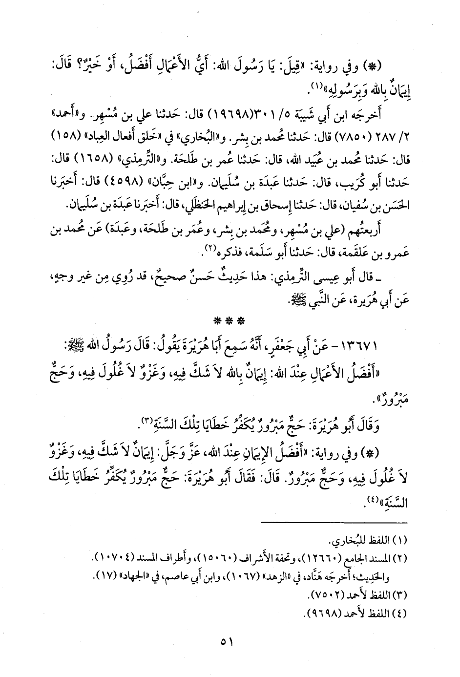 - وفي رواية: «أفضل الإيمان عند الله، عز وجل: إيمان لا شك فيه، وغزو لا غلول فيه، وحج مبرور. قال: فقال أَبو هريرة: حج مبرور يكفر خطايا تلك السنة» (¬٢)