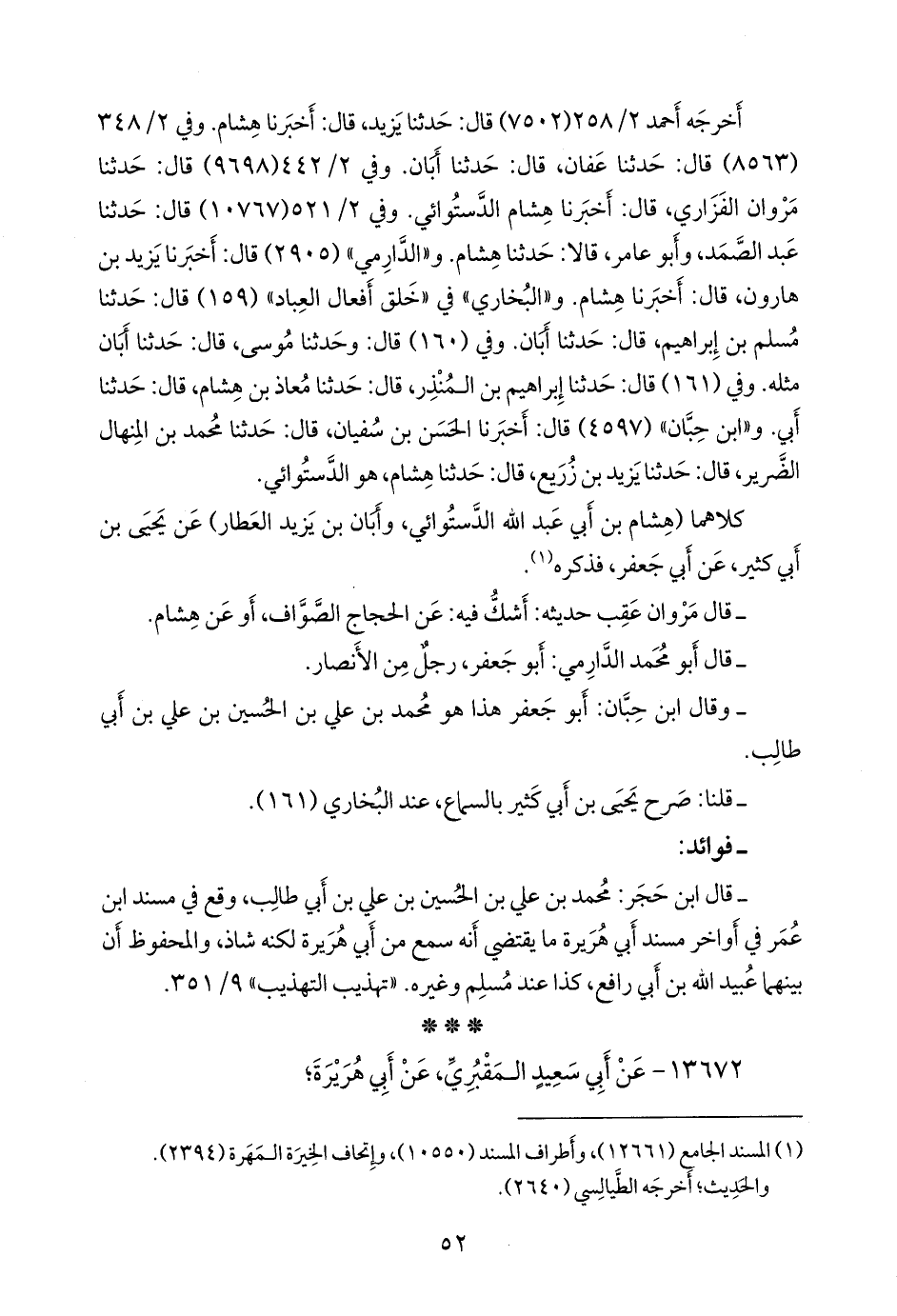 وفي (١٦٠) قال: وحدثنا موسى، قال: حدثنا أَبَان مثله. وفي (١٦١) قال: حدثنا إبراهيم بن المنذر، قال: حدثنا معاذ بن هشام، قال: حدثنا أبي. و «ابن حِبَّان» (٤٥٩٧) قال: أخبرنا الحسن بن سفيان، قال: حدثنا محمد بن المنهال الضرير، قال: حدثنا يزيد بن زُريع، قال: حدثنا هشام، هو الدَّستوائي.