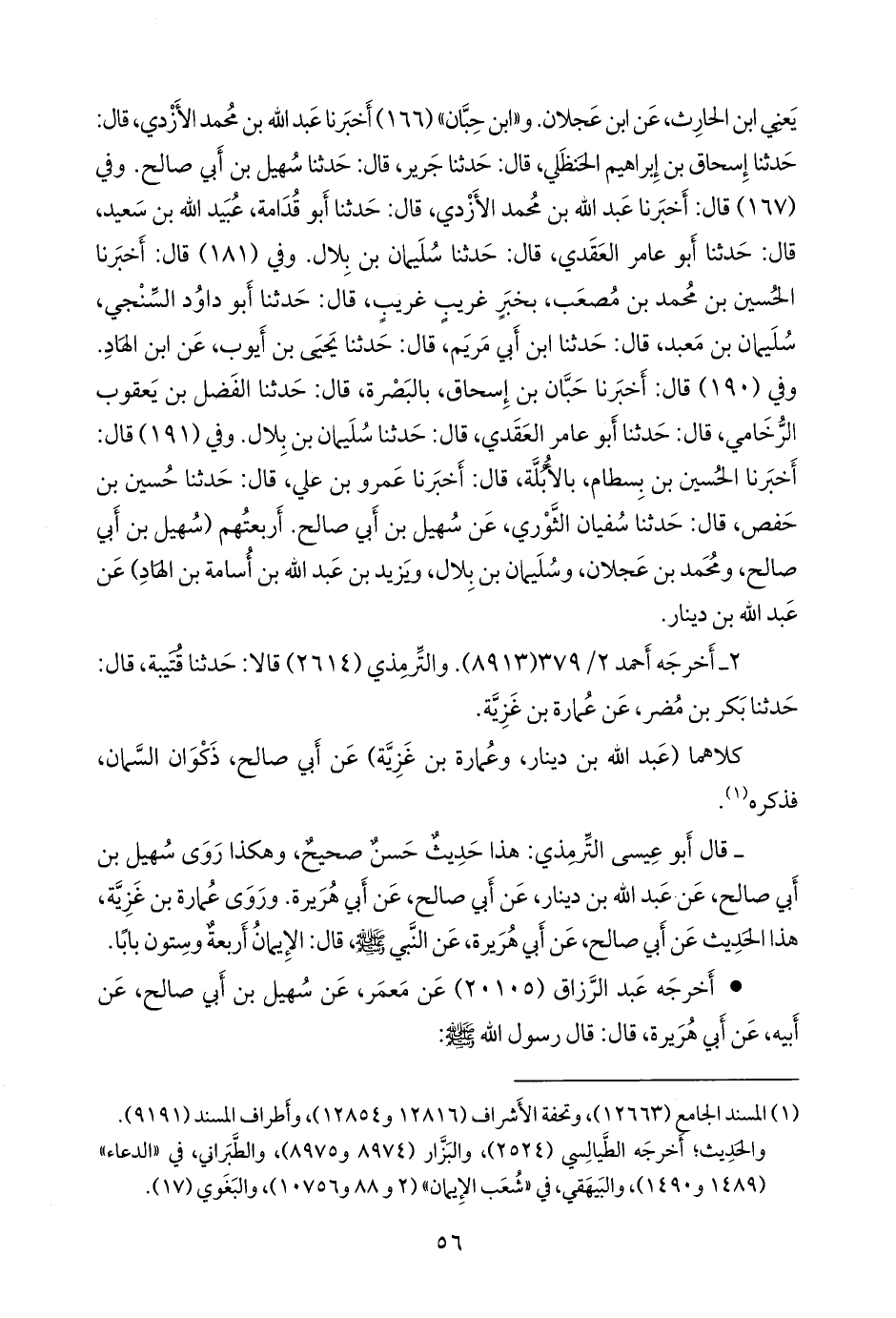 - قال التِّرمِذي: هذا حديثٌ حسنٌ صحيحٌ، وهكذا روى سهيل بن أبي صالح، عن عبد الله بن دينار، عن أبي صالح، عن أبي هريرة. وروى عمارة بن غَزِيَّة، هذا الحديث عن أبي صالح، عن أبي هريرة، عن النبي صَلى الله عَليه وسَلم قال: الإيمان أربعة وستون بابا.
