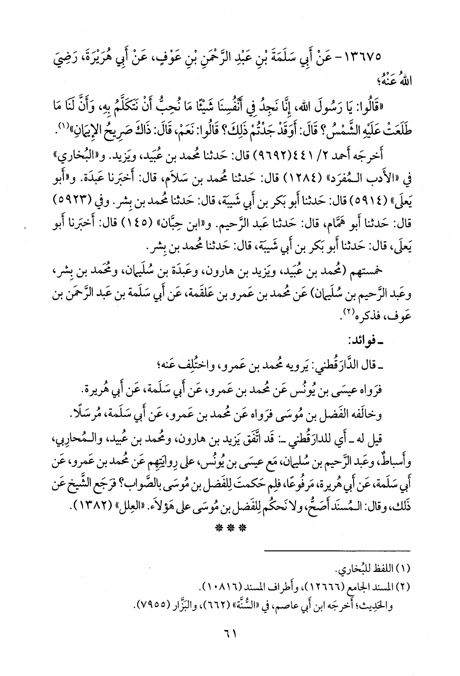 ١٣٦٧٥ - عن أبي سلمة بن عبد الرَّحمَن بن عوف، عن أبي هريرة، رضي الله عنه؛