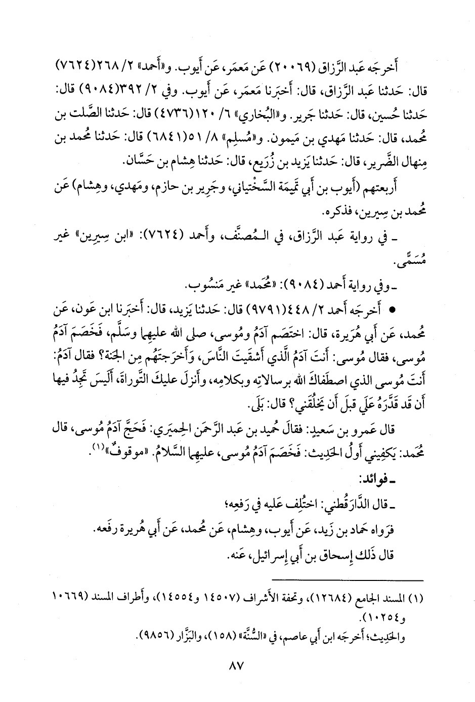 - سُئل الدارَقُطني عن حديث محمد بن سِيرين، عن أَبي هريرة، عن النبي صَلى الله عَليه وسَلم: احتج آدم وموسى، فقال: