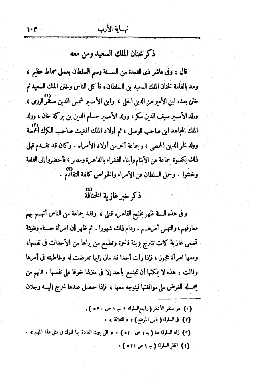 قال: وفى عاشر ذى القعدة من السنة رسم السلطان بعمل سماط عظيم، ومد بالقلعة لختان الملك السعيد بن السلطان، فأكل الناس وختن الملك السعيد ثم ختن بعده ابن الأمير عز الدين الحلى، وابن الأمير شمس الدين سنقر «1» الرومى، وولد الأمير سيف الدين سكر، وولد الأمير حسام الدين بن بركة خان، وولد الملك المجاهد ابن صاحب الوصل، ثم أولاد الملك المغيث صاحب الكرك الخمسة «2» وولد فخر الدين الحمصى، وجماعة أخر من أولاد الأمراء. وكان قد تقدم قبل ذلك بكسوة جماعة من الأيتام وأبناء الفقراء بالقاهرة ومصر، فأحضروا إلى القلعة وخنتوا. وحمل السلطان عن الأمراء والخواص كلفة التقادم «3» .