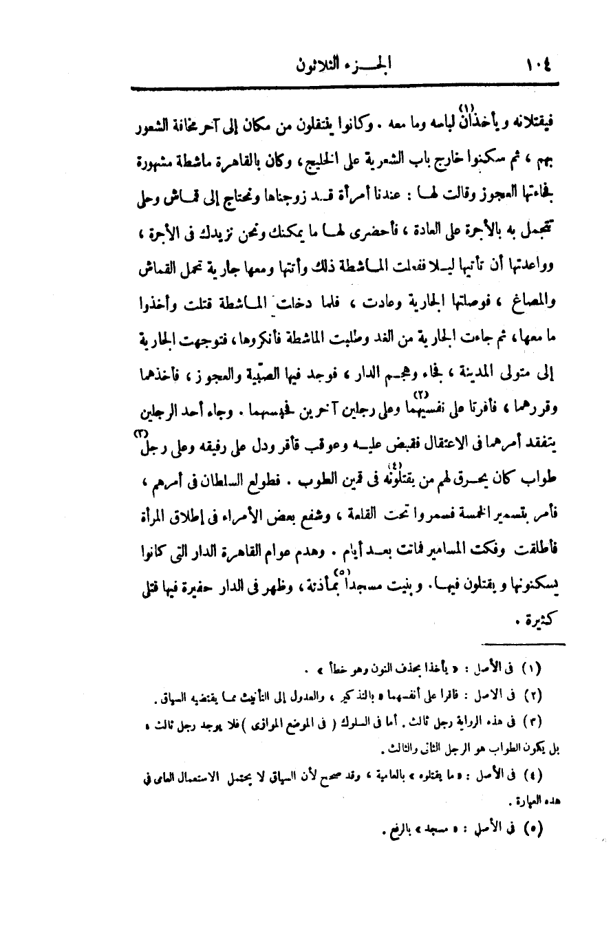 فيقتلانه ويأخذان «1» لباسه وما معه. وكانوا ينتقلون من مكان إلى آخر مخافة الشعور بهم، ثم سكنوا خارج باب الشعرية على الخليج، وكان بالقاهرة ماشطة مشهورة فجاءتها العجوز وقالت لها: عندنا أمرأة قد زوجناها ونحتاج إلى قماش وحلى تتجمل به بالأجرة على العادة، فأحضرى لها ما يمكنك ونحن نزيدك فى الأجرة، وواعدتها أن تأتيها ليلا ففعلت الماشطة ذلك وأتتها ومعها جارية تحمل القماش والمصاغ، فوصلتها الجارية وعادت، فلما دخلت الماشطة قتلت وأخذوا ما معها، ثم جاءت الجارية من الغد وطلبت الماشطة فأنكروها، فتوجهت الجارية إلى متولى المدينة، فجاء وهجم الدار، فوجد فيها الصبيّة والعجوز، فأخذهما وقررهما، فأفرتا على نفسيهما «2» وعلى رجلين آخرين فحبسهما. وجاء أحد الرجلين يتفقد أمرهما فى الاعتقال فقبض عليه وعوقب قأقر ودل على رفيقه وعلى رجل «3» طواب كان يحرق لهم من يقتلونه «4» فى قمين الطوب. فطولع السلطان فى أمرهم، فأمر بتسمير الخمسة فسمروا تحت القلعة، وشفع بعض الأمراء فى إطلاق المرأة فأطلقت وفكت المسامير فماتت بعد أيام. وهدم عوام القاهرة الدار التى كانوا يسكنونها ويقتلون فيها. وبنيت مسجدا «5» بمأذنة، وظهر فى الدار حفيرة فيها قتلى كثيرة.