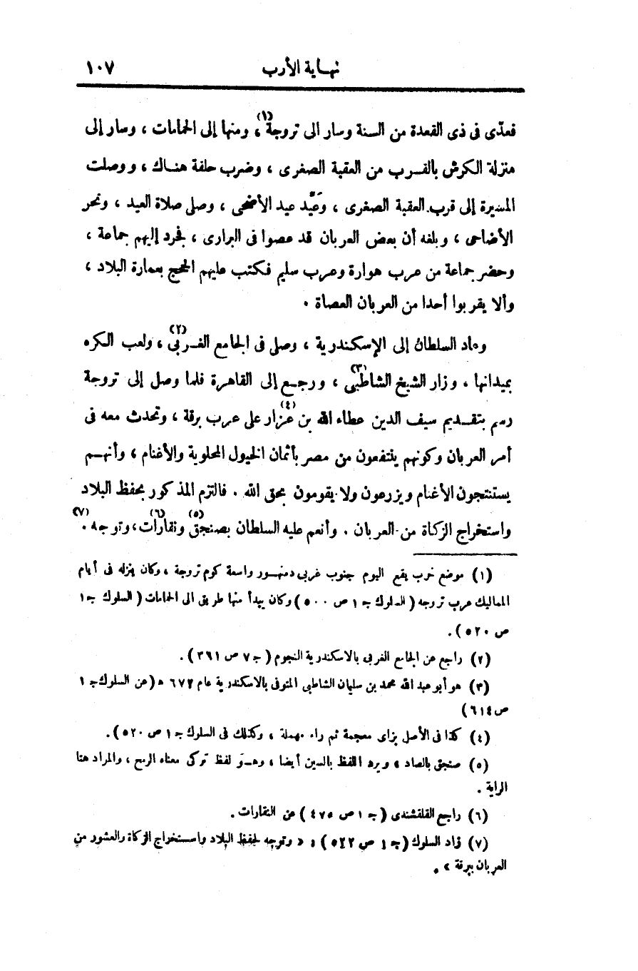 وعاد السلطان إلى الإسكندرية، وصلى فى الجامع الغربى «2» ، ولعب الكره بميدانها. وزار الشيخ الشاطبى «3» ، ورجع إلى القاهرة فلما وصل إلى تروجة رسم بتقديم سيف الدين عطاء الله بن عزار «4» على عرب برقة، وتحدث معه فى أمر العربان وكونهم ينتفعون من مصر بأثمان الخيول المحلوبة والأغنام، وأنهم يستنتجون الأغنام ويزرعون ولا يقومون بحق الله. فالتزم المذكور بحفظ البلاد واستخراج الزكاة من العربان. وأنعم عليه السلطان بصنجق «5» ونقارات «6» ، وتوجه «7» .