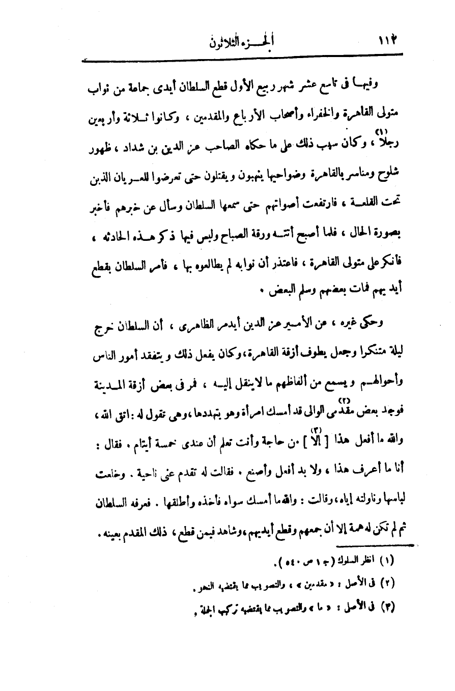 وفيها فى تاسع عشر شهر ربيع الأول قطع السلطان أيدى جماعة من نواب متولى القاهرة والخفراء وأصحاب الأرباع والمقدمين، وكانوا ثلاثة وأربعين رجلا «1» ، وكان سبب ذلك على ما حكاه الصاحب عز الدين بن شداد، ظهور شلوح ومناسر بالقاهرة وضواحيها ينهبون ويقتلون حتى تعرضوا للعربان الذين تحت القلعة، فارتفعت أصواتهم حتى سمعها السلطان وسأل عن خبرهم فأخبر بصورة الحال، فلما أصبح أتته ورقة الصباح وليس فيها ذكر هذه الحادثه، فأنكر على متولى القاهرة، فاعتذر أن نوابه لم يطالعوه بها، فأمر السلطان بقطع أيديهم فمات بعضهم وسلم البعض.
