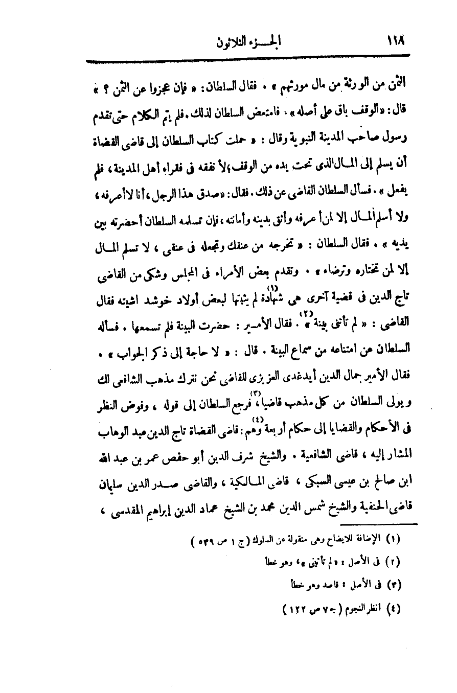 فقال الأمير جمال الدين أيدغدى العزيزى للقاضى نحن نترك مذهب الشافعى لك ويولى السلطان من كل مذهب قاضيا «3» ، فرجع السلطان إلى قوله، وفوض النظر فى الأحكام والقضايا إلى حكام أربعة «4» وهم: قاضى القضاة تاج الدين عبد الوهاب المشار إليه، قاضى الشافعية. والشيخ شرف الدين أبو حفص عمر بن عبد الله ابن صالح بن عيسى السبكى، قاضى المالكية، والقاضى صدر الدين سليمان قاضى الحنفية والشيخ شمس الدين محمد بن الشيخ عماد الدين إبراهيم المقدسى،