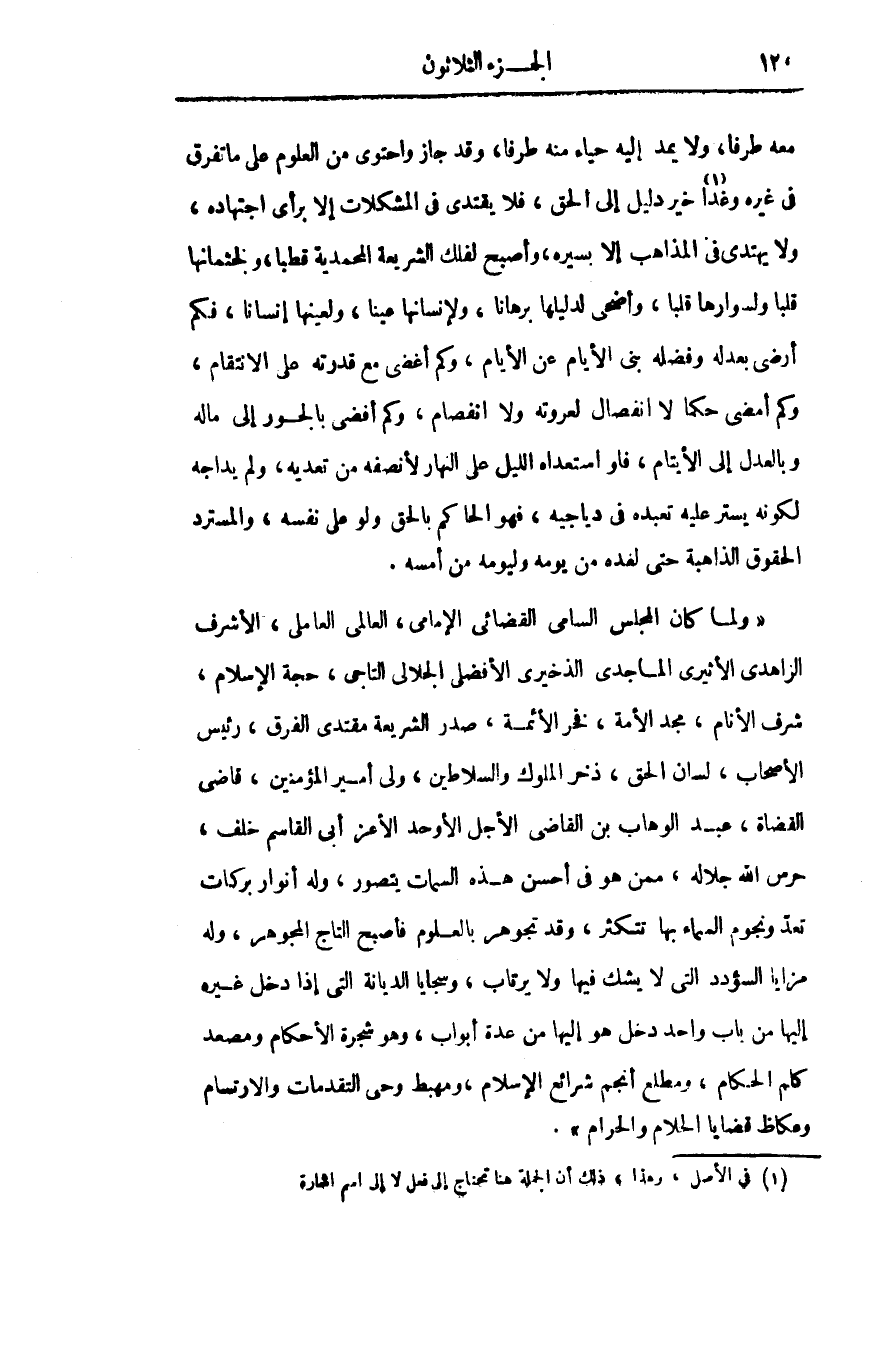 «ولما كان المجلس السامى القضائى الإمامى، العالمى العاملى، الأشرف الزاهدى الأثيرى الماجدى الذخيرى الأفضلى الجلالى التاجى، حجة الإسلام، شرف الأنام، مجد الأمة، فخر الأئمة، صدر الشريعة مقتدى الفرق، رئيس الأصحاب، لسان الحق، ذخر الملوك والسلاطين، ولى أمير المؤمنين، قاضى القضاة، عبد الوهاب بن القاضى الأجل الأوحد الأعز أبى القاسم خلف، حرس الله جلاله، ممن هو فى أحسن هذه السمات يتصور، وله أنوار بركات تعدّ ونجوم السماء بها تتكثر، وقد تجوهر بالعلوم فأصبح التاج المجوهر، وله مزايا السؤدد التى لا يشك فيها ولا يرتاب، وسجايا الديانة التى إذا دخل غيره إليها من باب واحد دخل هو إليها من عدة أبواب، وهو شجرة الأحكام ومصعد كلم الحكام، ومطلع أنجم شرائع الإسلام، ومهبط وحى التقدمات والارتسام وعكاظ قضايا الحلام والحرام» .