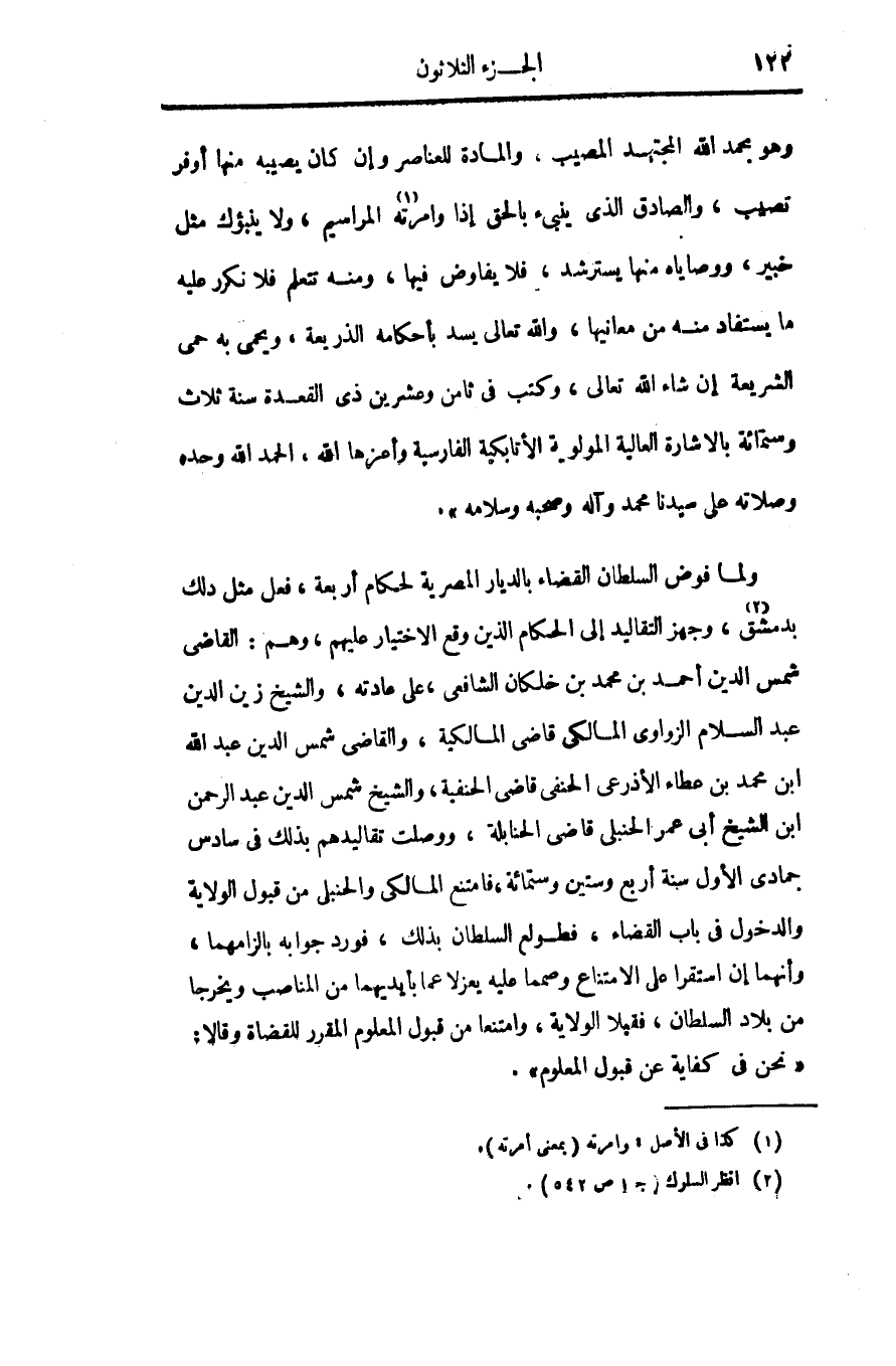 ولما فوض السلطان القضاء بالديار المصرية لحكام أربعة، فعل مثل ذلك بدمشق «2» ، وجهز التقاليد إلى الحكام الذين وقع الاختيار عليهم، وهم: القاضى شمس الدين أحمد بن محمد بن خلكان الشافعى، على عادته، والشيخ زين الدين عبد السلام الزواوى المالكى قاضى المالكية، والقاضى شمس الدين عبد الله ابن محمد بن عطاء الأذرعى الحنفى قاضى الحنيفة، والشيخ شمس الدين عبد الرحمن ابن الشيخ أبى عمر الحنبلى قاضى الحنابلة، ووصلت تقاليدهم بذلك فى سادس جمادى الأول سنة أربع وستين وستمائة، فامتنع المالكى والحنبلى من قبول الولاية والدخول فى باب القضاء، فطولع السلطان بذلك، فورد جوابه بالزامهما، وأنهما إن استقرا على الامتناع وصمما عليه يعزلا عما بأيديهما من المناصب ويخرجا من بلاد السلطان، فقيلا الولاية، وامتنعا من قبول المعلوم المقرر للقضاة وقالا: