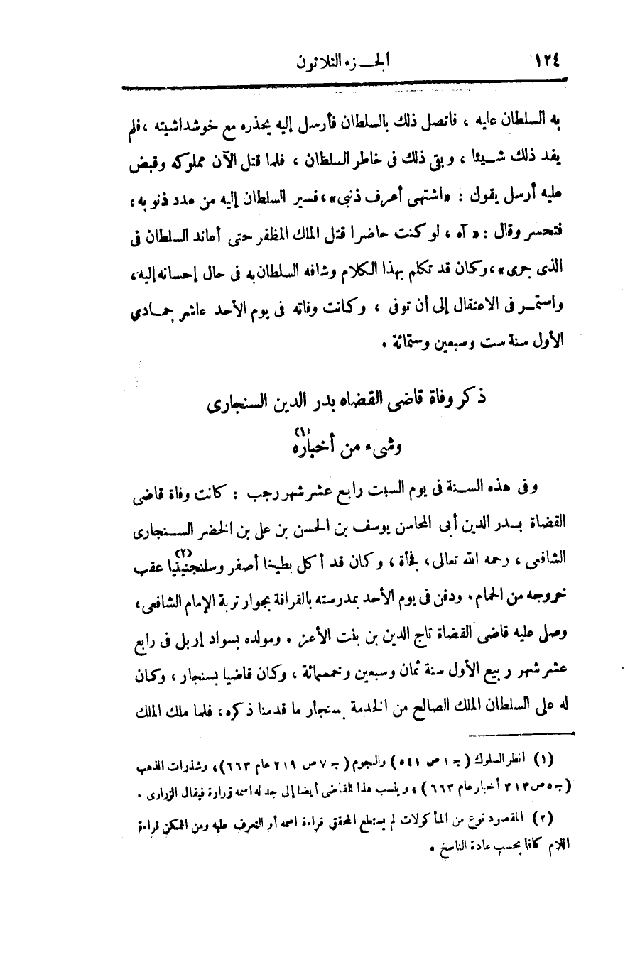 وفى هذه السنة فى يوم السبت رابع عشر شهر رجب: كانت وفاة قاضى القضاة بدر الدين أبى المحاسن يوسف بن الحسن بن على بن الخضر السنجارى الشافعى، رحمه الله تعالى، فجأة، وكان قد أكل بطيخا أصفر وسلنجنينيا «2» عقب خروجه من الحمام. ودفن فى يوم الأحد بمدرسته بالقرافة بجوار تربة الإمام الشافعى، وصلى عليه قاضى القضاة تاج الدين بن بنت الأعز. ومولده بسواد إربل فى رابع عشر شهر ربيع الأول سنة ثمان وسبعين وخمسمائة، وكان قاضيا بسنجار، وكان له على السلطان الملك الصالح من الخدمة بسنجار ما قدمنا ذكره، فلما ملك الملك