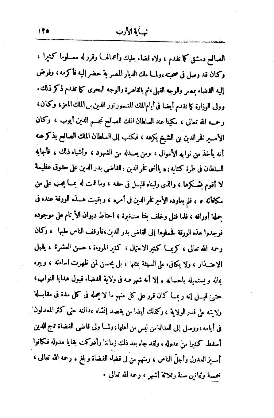 الصالح دمشق كما تقدم، ولاه قضاء بعلبك وأعمالها وقرر له معلوما كثيرا، وكان قد وصل فى صحبته، ولما ملك الديار المصرية حضر إليه فأكرمه، وفوض إليه القضاء بمصر والوجه القبلى، ثم بالقاهرة والوجه البحرى كما تقدم ذكر ذلك، وولى الوزارة كما تقدم أيضا فى أيام الملك المنسور نور الدين بن الملك المعز، وكان، رحمه الله تعالى، مكينا عند السلطان الملك الصالح نجم الدين أيوب، وكان الأمير فخر الدين بن الشيخ بكرهه، فكتب إلى السلطان الملك الصالح يذكر عنه أنه يأخذ من نوابه الأموال، ومن يعدله من الشهود، وأشباه ذلك، فأجابه السلطان فى طرة كتابه: «يا أخى فخر الدين: للقاضى بدر الدين على حقوق عظيمة لا أقوم بشكرها، والذى وليناه قليل فى حقه، وما قمت له بما يجب على من مكافأته» ، فلم يعاوده الأمير فخر الدين فى أمره، وبقيت هذه الورقة عنده فى جملة أوراقه، فلما قتل وخلف بنتا صغيرة، احتاط ديوان الأيتام على موجوده فوجدوا هذه الورقة فحملوها إلى القاضى بدر الدين، فأوقف الناس عليها، وكان رحمه الله تعالى، كريما كثير الاحتمال، كثير المروءة، حسن العشرة، يقبل الاعتذار، ولا يكافىء على السيئة بمثلها، بل يحسن لمن ظهرت اساءته، ويبره بماله ويستميله باحسانه، إلا أنه شهر عنه فى ولاية القضاء قبول هدايا النواب، حتى قيل إنه ربما كان قرر على كل منهم ما لا يحمله فى كل مدة فى مقابلة ولايته على قدر الولاية، وكذلك أيضا من يقصد إنشاء عدالته حتى كثر المعدلون فى أيامه، ووصل إلى العدالة من ليس من أهلها، ولما ولى قاضى القضاة تاج الدين أسقط كثيرا من عدوله، ولقد جاء بعد ذلك زماننا وأدركت بقايا عدوله فكانوا أميز العدول وأجلّ الناس، ومنهم من لى قضاء القضاة وبلغ، رحمه الله تعالى، خمسة وثمانين سنة وثلاثة أشهر، رحمه الله تعالى.