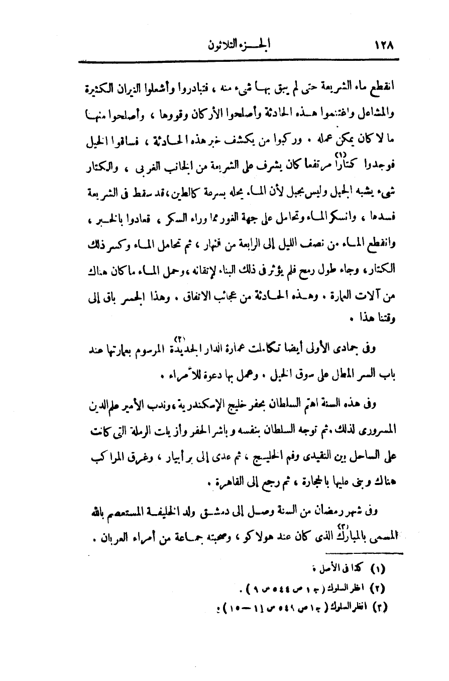 انقطع ماء الشريعة حتى لم يبق بها شىء منه، فتبادروا وأشعلوا النيران الكثيرة والمشاعل واغتنموا هذه الحادثة وأصلحوا الأركان وقووها، وأصلحوا منها ما لا كان يمكن عمله. وركبوا من يكشف خبر هذه الحادثة، فساقوا الخيل فوجدوا كتارا «1» مرتفعا كان يشرف على الشريعة من الجانب الغربى، والكتار شىء يشبه الجبل وليس بحبل لأن الماء يحله بسرعة كالطين، قد سقط فى الشريعة فسدها، وانسكر الماء وتحامل على جهة الغور مما وراء السكر، قعادوا بالخبر، وانقطع الماء من نصف الليل إلى الرابعة من النهار، ثم تحامل الماء وكسر ذلك الكتار، وجاء طول رمح فلم يؤثر فى ذلك البناء لإتقانه، وحمل الماء ما كان هناك من آلات العمارة. وهذه الحادثة من عجائب الاتفاق. وهذا الجسر باق إلى وقتنا هذا.