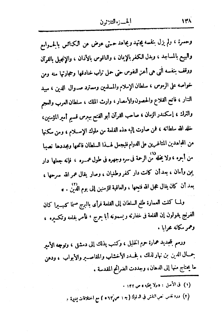 وحسرة، ولم يزل بنفسه يجتهد ويجاهد حتى عوض عن الكنائس بالجوامع والبيع بالمساجد، وبدل الكفر بالإيمان، والناقوس بالأذان، والإنجيل بالقرآن ووقف بنفسه التى هى أعز النفوس حتى حمل تراب خنادقها وحجارتها منه ومن خواصه على الرءوس، سلطان الإسلام والمسلمين ومسترد صوال الدين، مبيد التتار، فاتح القلاع والحصون والأمصار، وارث الملك، سلطان العرب والعجم والترك، إسكندر الزمان، صاحب القرآن أبو الفتح بيبرس قسيم أمير المؤمنين، خلد الله سلطانه، فمن صارت إليه هذه القلعة من ملوك الإسلام، ومن سكنها من المجاهدين المثاغرين على الدوام فليجعل لهذا السلطان فاتحها ومجددها نصيبا من أجره، ولا يخله «1» من الرحمة فى سره وجهره فى طول عمره، فإنه جعلها دار يمن وأمان، بعد أن كانت دار كفر وطغيان، وصار يقال عمر الله سرحها، بعد أن كان يقال عجل الله فتحها، والعاقبة للمؤمنين إلى يوم الدين «2» .»