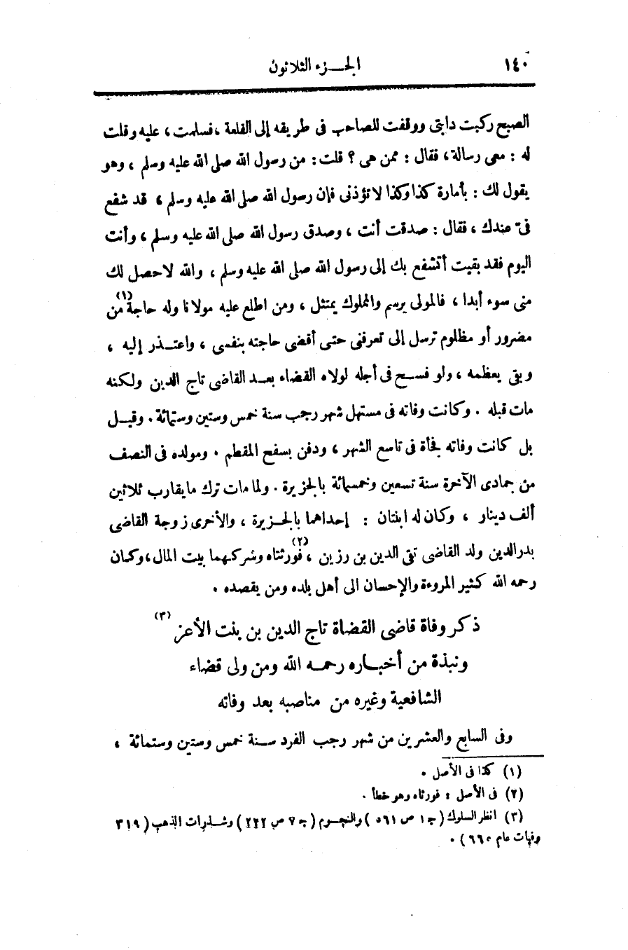 الصبح ركبت دابتى ووقفت للصاحب فى طريقه إلى القلعة، فسلمت، عليه وقلت له: معى رسالة، فقال: ممن هى؟ قلت: من رسول الله صلّى الله عليه وسلّم، وهو يقول لك: بأمارة كذا وكذا لا تؤذنى فإن رسول الله صلّى الله عليه وسلّم، قد شفع فى عندك، فقال: صدقت أنت، وصدق رسول الله صلّى الله عليه وسلّم، وانت اليوم فقد بقيت أتشفع بك إلى رسول الله صلّى الله عليه وسلّم، والله لا حصل لك منى سوء أبدا، فالمولى يرسم والمملوك يمتثل، ومن اطلع عليه مولانا وله حاجة «1» من مضرور أو مظلوم ترسل إلى تعرفنى حتى أقضى حاجته بنفسى، واعتذر إليه، وبقى يعظمه، ولو فسح فى أجله لولاه القضاء بعد القاضى تاج الدين ولكنه مات قبله. وكانت وفاته فى مستهل شهر رجب سنة خمس وستين وستمائة. وقيل بل كانت وفاته فجأة فى تاسع الشهر، ودفن بسفح المقطم. ومولده فى النصف من جمادى الآخرة سنة تسعين وخمسمائة بالجزيرة. ولما مات ترك ما يقارب ثلاثين ألف دينار، وكان له ابنتان: إحداهما بالجزيرة، والأخرى زوجة القاضى بدر الدين ولد القاضى تقى الدين بن رزين، «2» فورثتاه وشركهما بيت المال، وكان رحمه الله كثير المروءة والإحسان الى أهل بلده ومن يقصده.