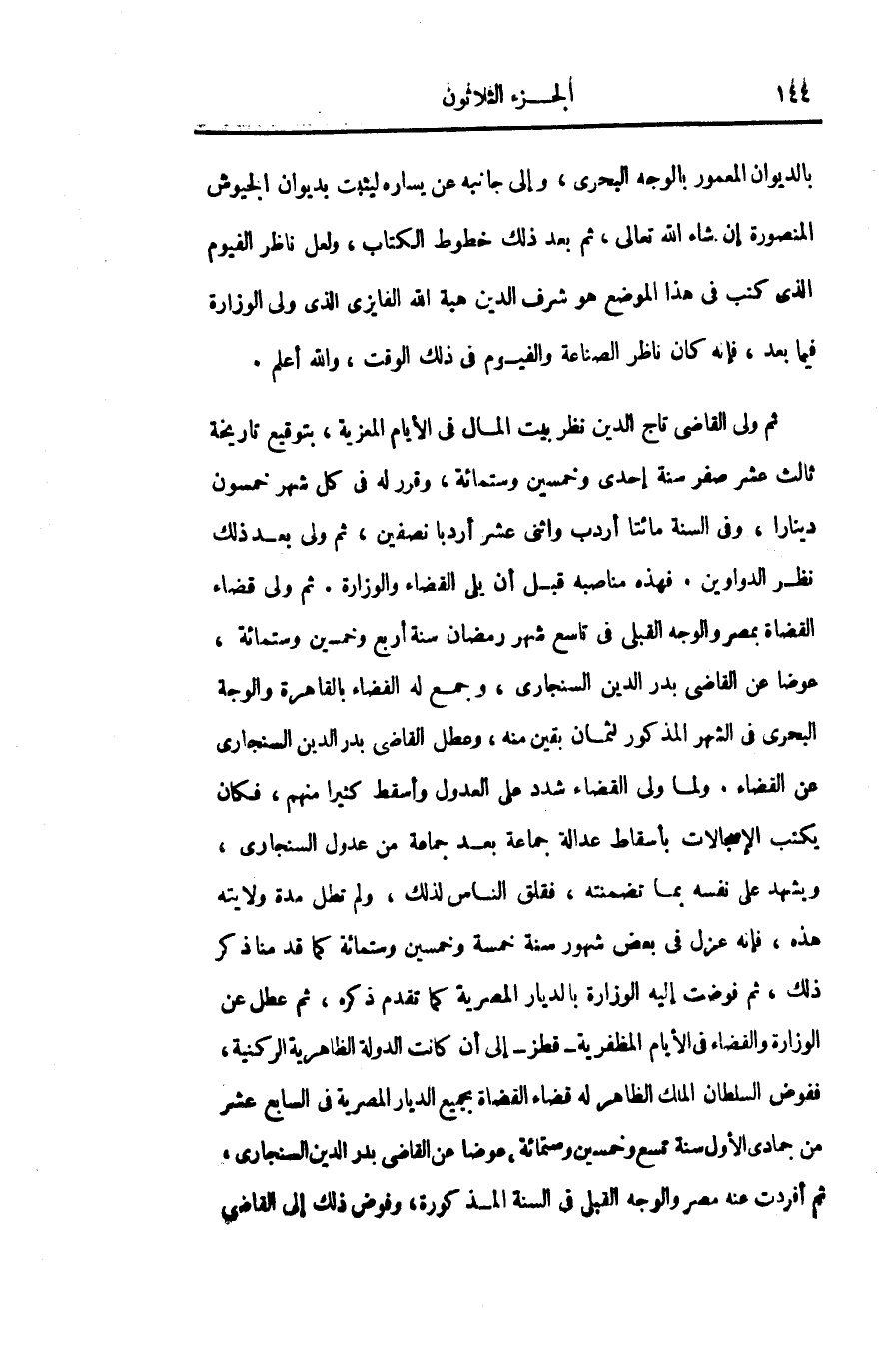 ثم ولى القاضى تاج الدين نظر بيت المال فى الأيام المعزية، بتوقيع تاريخة ثالث عشر صفر سنة إحدى وخمسين وستمائة، وقرر له فى كل شهر خمسون دينارا، وفى السنة مائتا أردب واثنى عشر أردبا نصفين، ثم ولى بعد ذلك نظر الدواوين. فهذه مناصبه قبل أن يلى القضاء والوزارة. ثم ولى قضاء القضاة بمصر والوجه القبلى فى تاسع شهر رمضان سنة أربع وخمسين وستمائة، عوضا عن القاضى بدر الدين السنجارى، وجمع له القضاء بالقاهرة والوجة البحرى فى الشهر المذكور لثمان بقين منه، وعطل القاضى بدر الدين السنجارى عن القضاء. ولما ولى القضاء شدد على العدول وأسقط كثيرا منهم، فكان يكتب؟؟؟ بأسقاط عدالة جماعة بعد جماعة من عدول السنجارى، ويشهد على نفسه بما تضمنته، فقلق الناس لذلك، ولم تطل مدة ولايته هذه، فإنه عزل فى بعض شهور سنة خمسة وخمسين وستمائة كما قدمنا ذكر ذلك، ثم فوضت إليه الوزارة بالديار المصرية كما تقدم ذكره، ثم عطل عن الوزارة والقضاء فى الأيام المظفرية- قطز- إلى أن كانت الدولة الظاهرية الركنية، ففوض السلطان الملك الظاهر له قضاء القضاة بجميع الديار المصرية فى السابع عشر من جمادى الأول سنة تسع وخمسين وستمائة، عوضا عن القاضى بدر الدين السنجارى، ثم أفردت عنه مصر والوجه القبلى فى السنة المذكورة، وفوض ذلك إلى القاضى