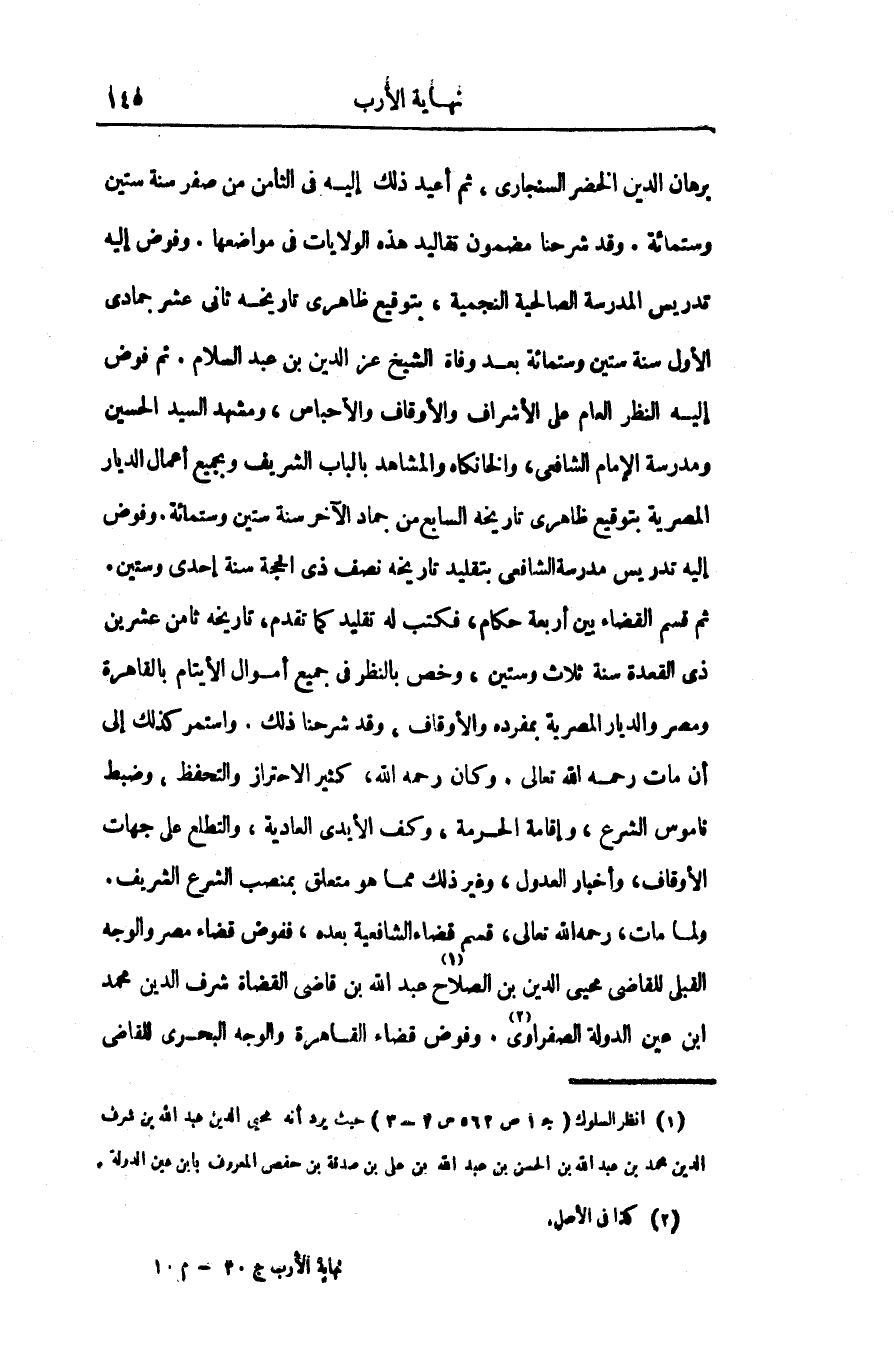 برهان الدين الخضر السنجارى، ثم أعيد ذلك إليه فى الثامن من صفر سنة ستين وستمائة. وقد شرحنا مضمون تقاليد هذه الولايات فى مواضعها. وفوض إليه تدريس المدرسة الصالحية النجمية، بتوقيع ظاهرى تاريخه ثانى عشر جمادى الأول سنة ستين وستمائة بعد وفاة الشيخ عز الدين بن عبد السلام. ثم فوض إليه النظر العام على الأشراف والأوقاف والأحباس، ومشهد السيد الحسين ومدرسة الإمام الشافعى، والخانكاه والمشاهد بالباب الشريف وبجميع أعمال الديار المصرية بتوقيع ظاهرى تاريخه السابع من جماد الآخر سنة ستين وستمائة. وفوض إليه تدريس مدرسة الشافعى بتقليد تاريخه نصف ذى الحجة سنة إحدى وستين.