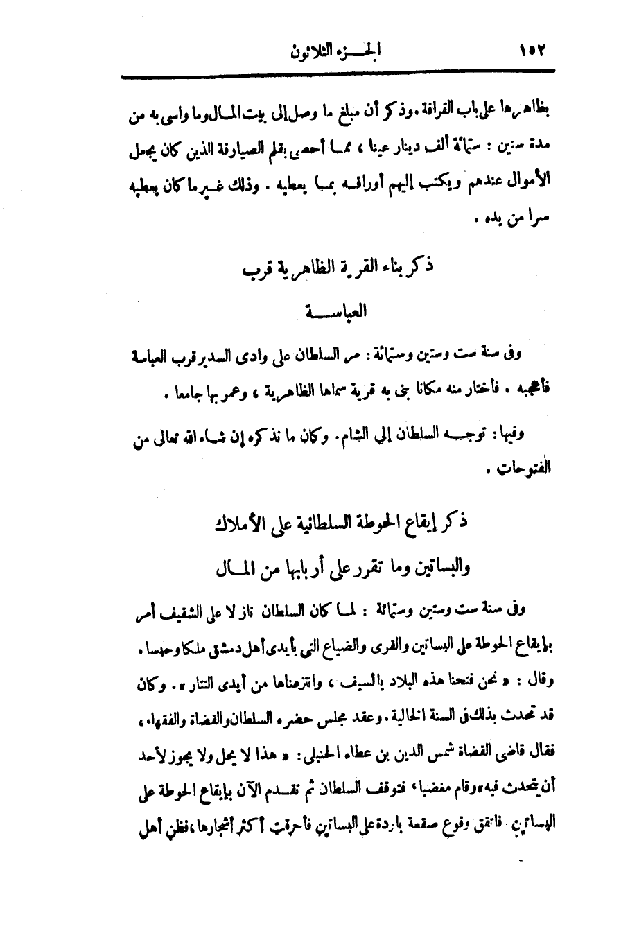 وقال: «نحن فتحنا هذه البلاد بالسيف، وانتزعناها من أيدى التتار» . وكان قد تحدث بذلك فى السنة الخالية. وعقد مجلس حضره السلطان والقضاة والفقهاء، فقال قاضى القضاة شمس الدين بن عطاء الحنبلى: «هذا لا يحل ولا يجوز لأحد أن يتحدث فيه» وقام مغضبا، فتوقف السلطان ثم تقدم الآن بإيقاع الحوطة على البساتين فاتقق وقوع صقعة باردة على البساتين فأحرقت أكثر أشجارها، فظن أهل