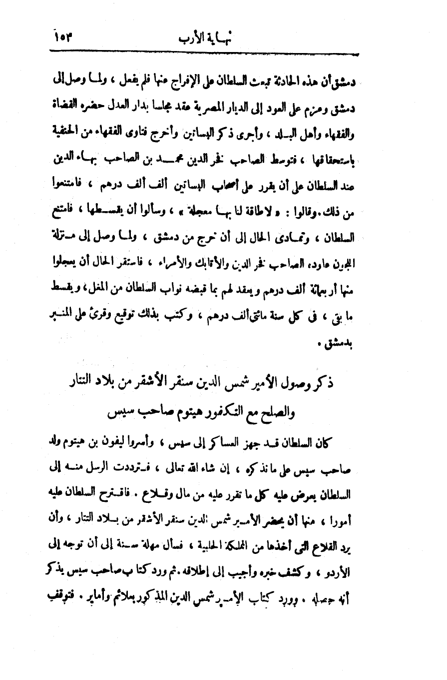 كان السلطان قد جهز العساكر إلى سيس، وأسروا ليفون بن هيتوم ولد صاحب سيس على ما نذكره، إن شاء الله تعالى، فترددت الرسل منه إلى السلطان يعرض عليه كل ما تقرر عليه من مال وقلاع. فاقترح السلطان عليه أمورا، منها أن يحضر الأمير شمس الدين سنقر الأشقر من بلاد التتار، وأن يرد القلاع التى أخذها من المملكة الحلبية، فسأل مهلة سنة إلى أن توجه إلى الأردو، وكشف خبره وأجيب إلى إطلاقه. ثم ورد كتاب صاحب سيس بذكر أنه حصله. وورد كتاب الأمير شمس الدين المذكور بعلائم وأماير. فتوقف