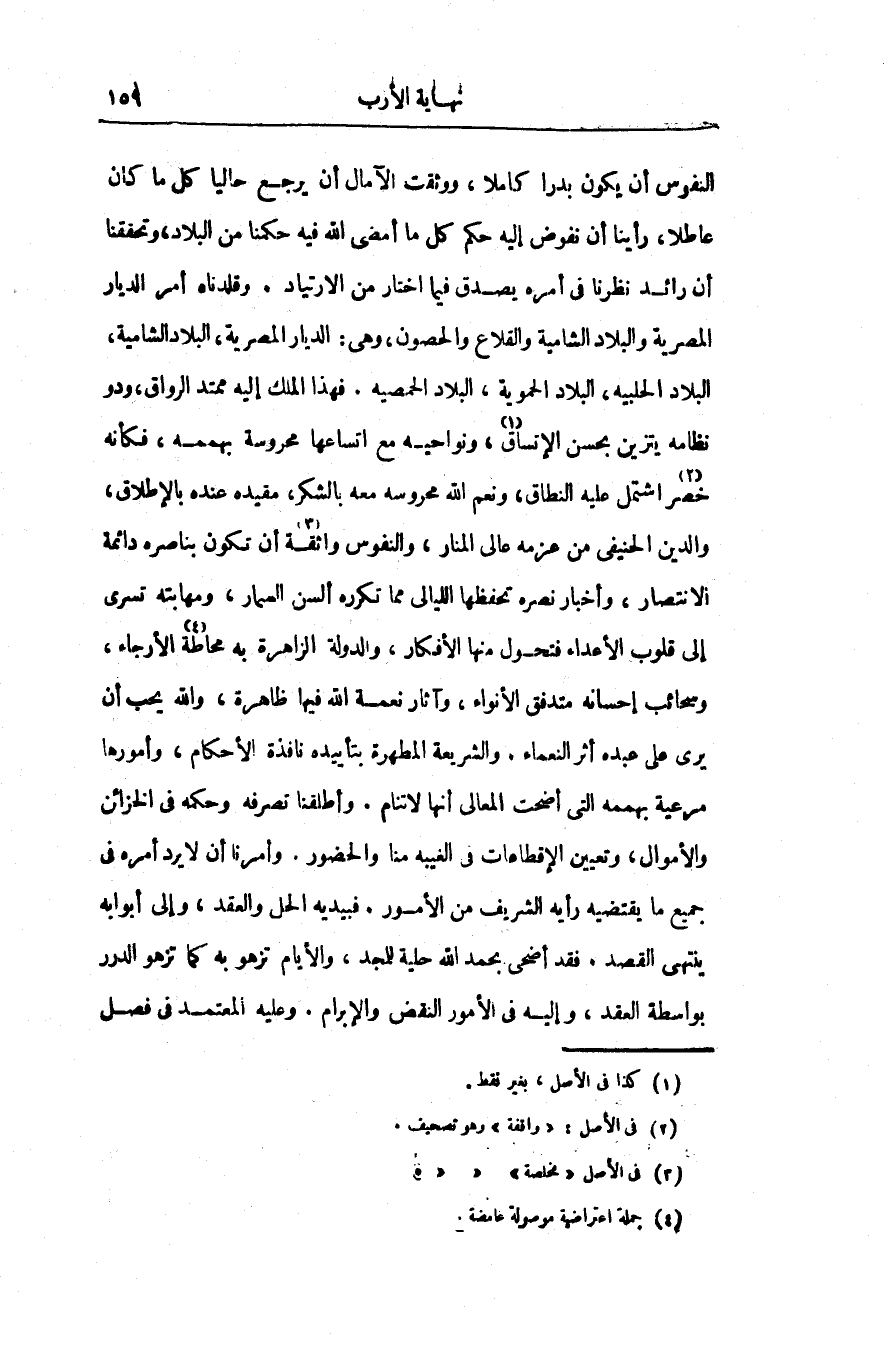 النفوس أن يكون بدرا كاملا، ووثقت الآمال أن يرجع حاليا كل ما كان عاطلا، رأينا أن نفوض إليه حكم كل ما أمضى الله فيه حكمنا من البلاد، وتحققنا أن رائد نظرنا فى أمره يصدق فيما اختار من الارتياد. وقلدناه أمر الديار المصرية والبلاد الشامية والقلاع والحصون، وهى: الديار المصرية، البلاد الشامية، البلاد الحلبيه، البلاد الحموية، البلاد الحمصيه. فهذا الملك إليه ممتد الرواق، ودو نظامه يتزين بحسن الإتساق «1» ، ونواحيه مع اتساعها محروسة بهممه، فكأنه خصر «2» اشتمل عليه النطاق، ونعم الله محروسه معه بالشكر، مفيده عنده بالإطلاق، والدين الحنيفى من عزمه عالى المنار، والنفوس واثقة «3» أن تكون بناصره دائمة الانتصار، وأخبار نصره تحفظها الليالى مما تكرره ألسن السمار، ومهابته تسرى إلى قلوب الأعداء فتحول منها الأفكار، والدولة الزاهرة به محاطة «4» الأرجاء، وسحائب إحسانه متدفق الأنواء، وآثار نعمة الله فيها ظاهرة، والله يحب أن يرى على عبده أثر النعماء. والشريعة المطهرة بتأييده نافذة الأحكام، وأمورها مرعية بهممه التى أضحت المعالى أنها لا تنام. وأطلقنا تصرفه وحكمه فى الخزائن والأموال، وتعيين الإقطاعات فى الغيبه منا والحضور. وأمرنا أن لا يرد أمره فى جميع ما يقتضيه رأيه الشريف من الأمور. فبيديه الحل والعقد، وإلى أبوابه ينتهى القصد. فقد أضحى بحمد الله حلية للمجد، والأيام تزهو به كما تزهو الدرر بواسطة العقد، وإليه فى الأمور النقض والإبرام. وعليه المعتمد فى فصل