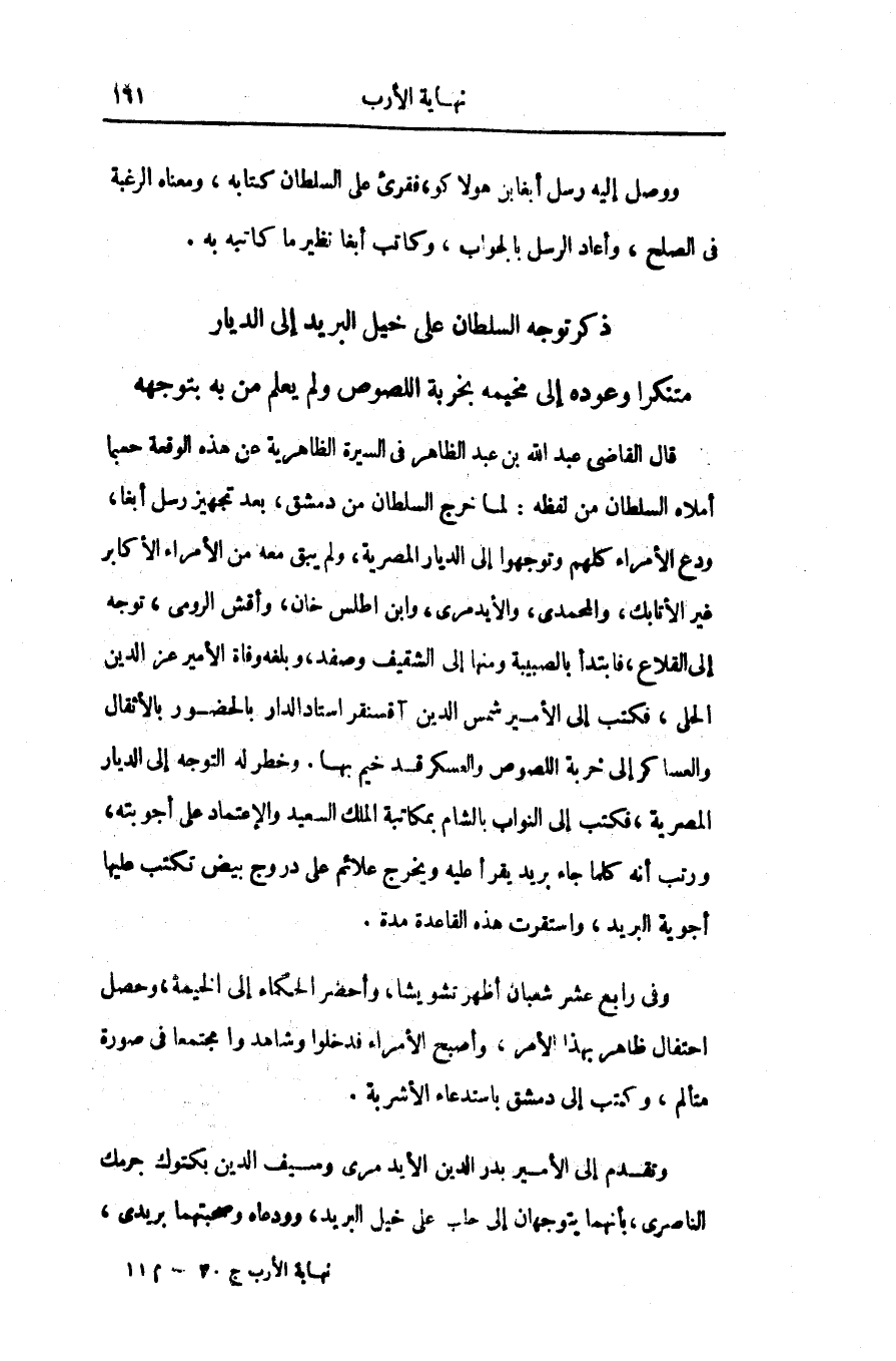 ذكر توجه السلطان على خيل البريد إلى الديار متنكرا وعوده إلى مخيمه بخربة اللصوص ولم يعلم من به بتوجهه