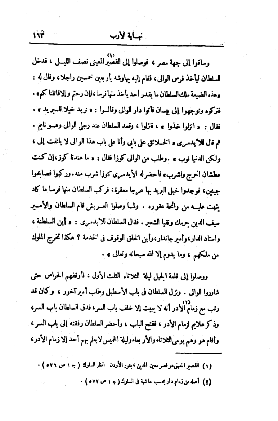 ووصلوا إلى قلعة الجبل ليلة الثلاثاء الثلث الأول، فأوقفهم الحراس حتى شاوروا الوالى. ونزل السلطان فى باب الأسطبل وطلب أمير آخور، وكان قد رتب مع زمام «2» الأدر أنه لا يبيت إلا خلف باب السر، فدق السلطان باب السر، وذكر علايم لزمام الأدر، ففتح الباب، وأحضر السلطان رفقته إلى باب السر، وأقام هو وهم يومى الثلاثاء والأربعاء وليلة الخميس لا يعلم بهم أحد إلا زمام الأدر،