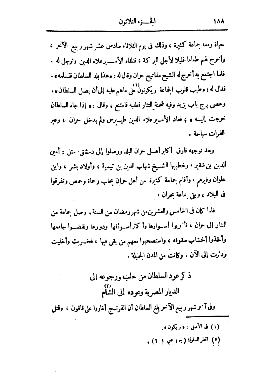 فلما كان فى الخامس والعشرين من شهر رمضان من السنة، وصل جماعة من التتار إلى حران،؟؟؟ أسوارها وأكثر أسوافها ودورها ونقضوا جامعها وأخذوا أخشاب سقوفه، واستصحبوا معهم من بقى فيها، فخربت وأخليت و؟؟؟ إلى الآن. وكانت من المدن الجليلة.