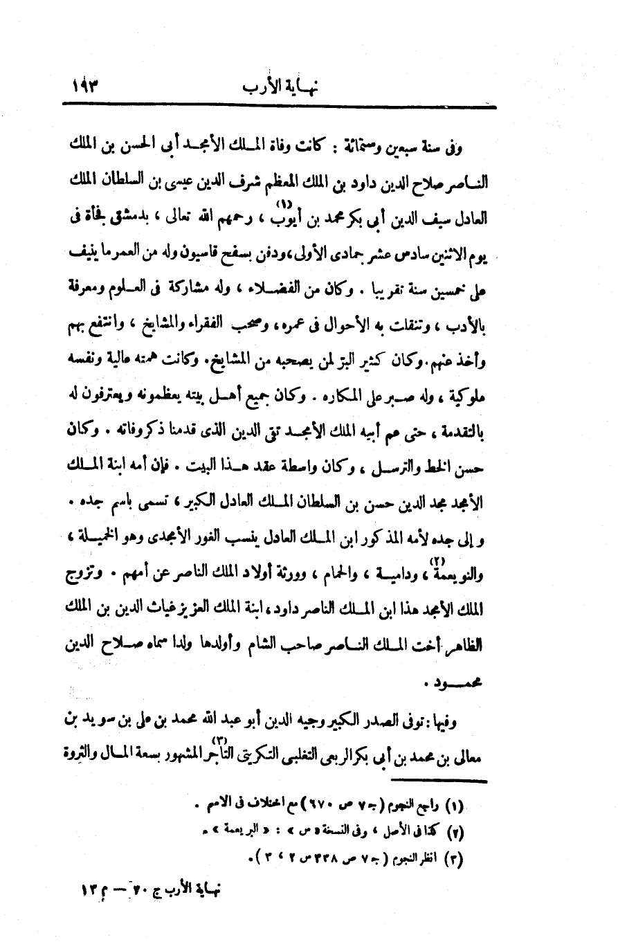 وفى سنة سبعين وستمائة: كانت وفاة الملك الأمجد أبى الحسن بن الملك الناصر صلاح الدين داود بن الملك المعظم شرف الدين عيسى بن السلطان الملك العادل سيف الدين أبى بكر محمد بن أيوب «1» ، رحمهم الله تعالى، بدمشق فجأة فى يوم الاثنين سادس عشر جمادى الأولى، ودفن بسفح قاسيون وله من العمر ما ينيف على خمسين سنة تقريبا. وكان من الفضلاء، وله مشاركة فى العلوم ومعرفة بالأدب، وتنقلت به الأحوال فى عمره، وصحب الفقراء والمشايخ، وانتفع بهم وأخذ عنهم. وكان كثير البرّ لمن يصحبه من المشايخ. وكانت همته عالية ونفسه ملوكية، وله صبر على المكاره. وكان جميع أهل بيته يعظمونه ويعترفون له بالتقدمة، حتى هم أبيه الملك الأمجد تقى الدين الذى قدمنا ذكر وفاته. وكان حسن الخط والترسل، وكان واسطة عقد هذا البيت. فإن أمه ابنة الملك الأمجد مجد الدين حسن بن السلطان الملك العادل الكبير، تسمى باسم جده.