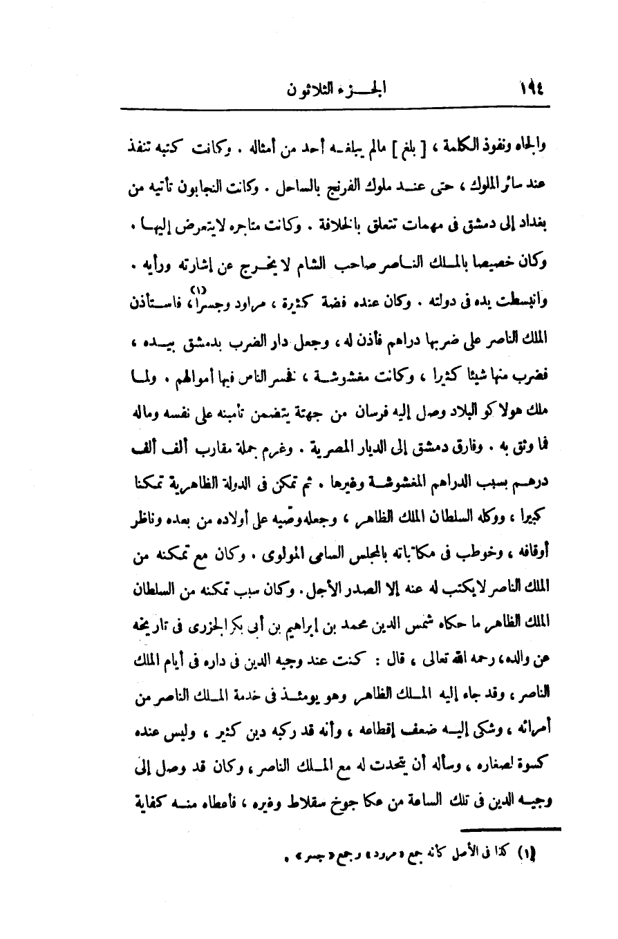 والجاه ونفوذ الكلمة، [بلغ] مالم يبلغه أحد من أمثاله. وكانت كتبه تنفذ عند سائر الملوك، حتى عند ملوك الفرنج بالساحل. وكانت النجابون تأتيه من بغداد إلى دمشق فى مهمات تتعلق بالخلافة. وكانت متاجره لا يتعرض إليها.