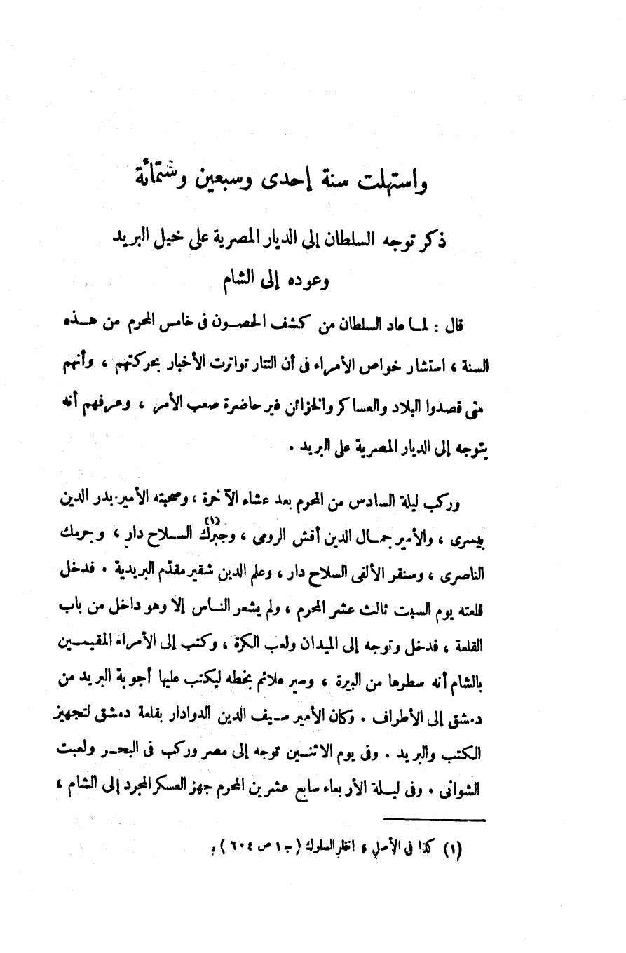 قال: لما عاد السلطان من كشف الحصون فى خامس المحرم من هذه السنة، استشار خواص الأمراء فى أن التتار تواترت الأخبار بحركتهم، وأنهم متى قصدوا البلاد والعساكر والخزائن غير حاضرة صعب الأمر، وعرفهم أنه بتوجه إلى الديار المصرية على البريد.