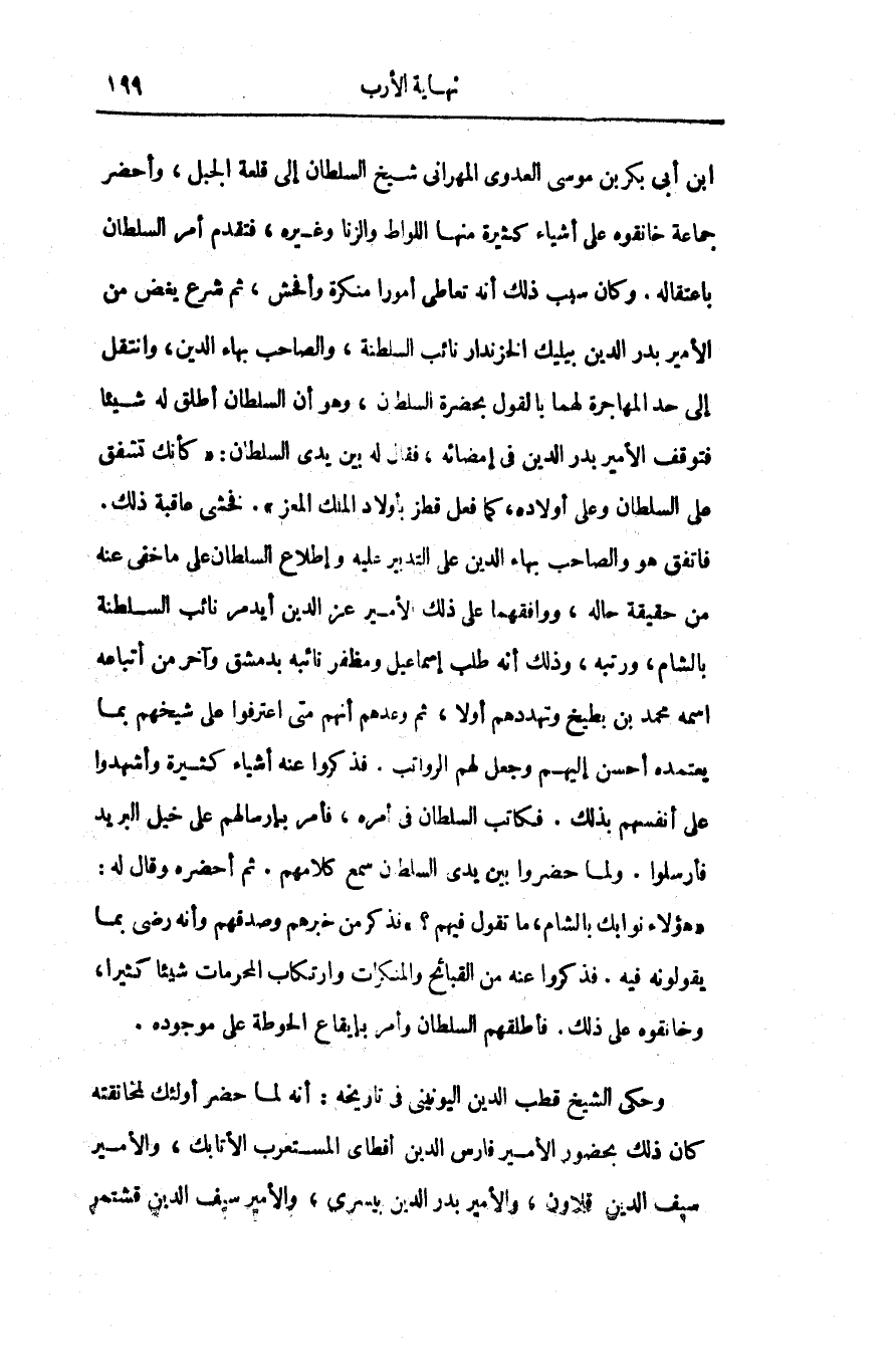 ابن أبى بكر بن موسى العدوى المهرانى شيخ السلطان إلى قلعة الجبل، وأحضر جماعة خانقوه على أشياء كثيرة منها اللواط والزنا وغيره، فتقدم أمر السلطان باعتقاله. وكان سبب ذلك أنه تعاطى أمورا منكرة وأفحش، ثم شرع يغض من الأمير بدر الدين بيليك الخزندار نائب السلطنة، والصاحب بهاء الدين، وانتقل إلى حد المهاجرة لهما بالقول بحضرة السلطان، وهو أن السلطان أطلق له شيئا فتوقف الأمير بدر الدين فى إمضائه، فقال له بين يدى السلطان: «كأنك تشفق على السلطان وعلى أولاده، كما فعل قطز بأولاد الملك المعز» . فخشى عاقبة ذلك.