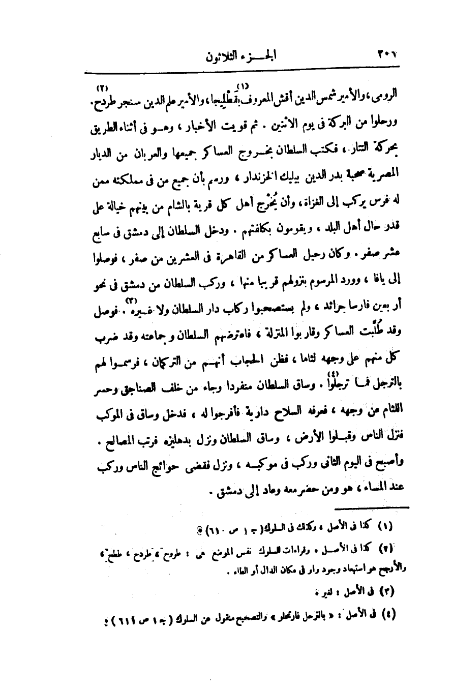 ورحلوا من البركة فى يوم الاثنين. ثم قويت الأخبار، وهو فى أثناء الطريق بحركة التتار، فكتب السلطان بخروج العساكر جميعها والعربان من الديار المصرية صحبة بدر الدين بيليك الخزندار، ورسم بأن جميع من فى مملكته ممن له فرس يركب إلى الغزاة، وأن يخرج أهل كل قرية بالشام من بينهم خيالة على قدر حال أهل البلد، ويقومون بكلفتهم. ودخل السلطان إلى دمشق فى سابع عشر صفر. وكان رحيل العساكر من القاهرة فى العشرين من صفر، فوصلوا إلى يافا، وورد المرسوم بنزولهم قريبا منها، وركب السلطان من دمشق فى نحو أربعين فارسا جرائد، ولم يستصحبوا ركاب دار السلطان ولا غيره «3» . فوصل وقد طلّبت العساكر وقاربوا المنزلة، فاعترضهم السلطان وجماعته وقد ضرب كل منهم على وجهه لثاما، فظن الحجاب أنهم من التركمان، فرسموا لهم بالترجل فما ترجلوا «4» . وساق السلطان منفردا وجاء من خلف الصناجق وحسر اللثام عن وجهه، فعرفه السلاح دارية فأفرجوا له، فدخل وساق فى الموكب فنزل الناس وقبلوا الأرض، وساق السلطان ونزل بدهليزه فرتب المصالح.