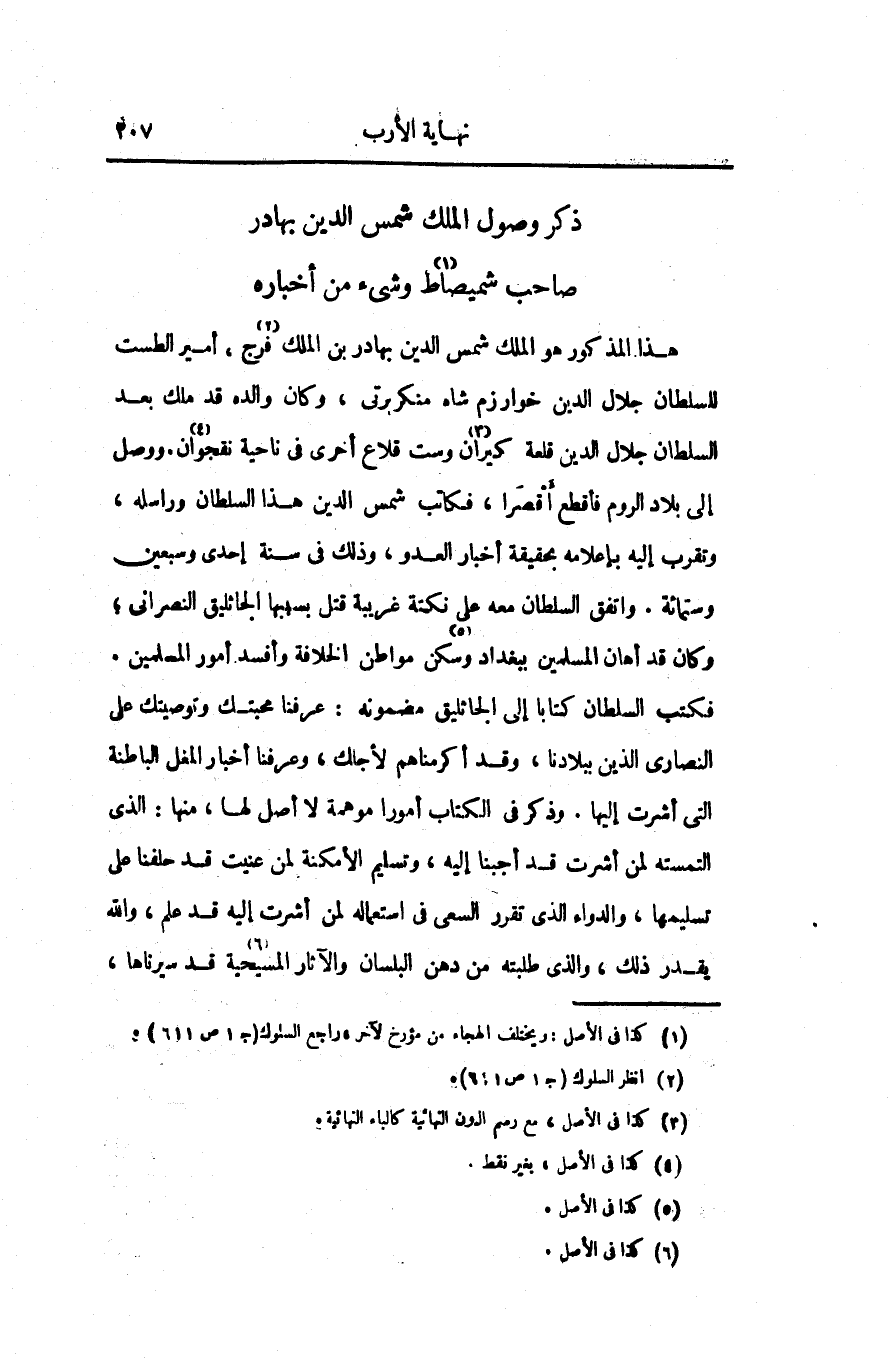 هذا المذكور هو الملك شمس الدين بهادر بن الملك فرج «2» ، أمير الطست للسلطان جلال الدين خوارزم شاه منكربرتى، وكان والده قد ملك بعد السلطان جلال الدين قلعة كيران «3» وست قلاع أخرى فى ناحية نقجوان «4» . ووصل إلى بلاد الروم فأقطع أقصرا، فكاتب شمس الدين هذا السلطان وراسله، وتقرب إليه بإعلامه بحقيقة أخبار العدو، وذلك فى سنة إحدى وسبعين وستمائة. واتفق السلطان معه على نكتة غريبة قتل بسببها الجاثليق النصرانى؛ وكان قد أهان المسلمين ببغداد وسكن «5» مواطن الخلافة وأفسد أمور المسلمين.
