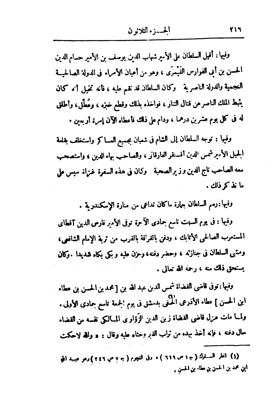 وفيها: توجه السلطان إلى الشام فى شعبان بجميع العساكر واستخلف بقلعة الجبل الأمير شمس الدين أقسنقر الفارقانى، والصاحب بهاء الدين، واستصحب معه الصاحب تاج الدين وزير الصحبة وكان فى هذه السفرة غزاة سبس على ما نذكر ذلك.