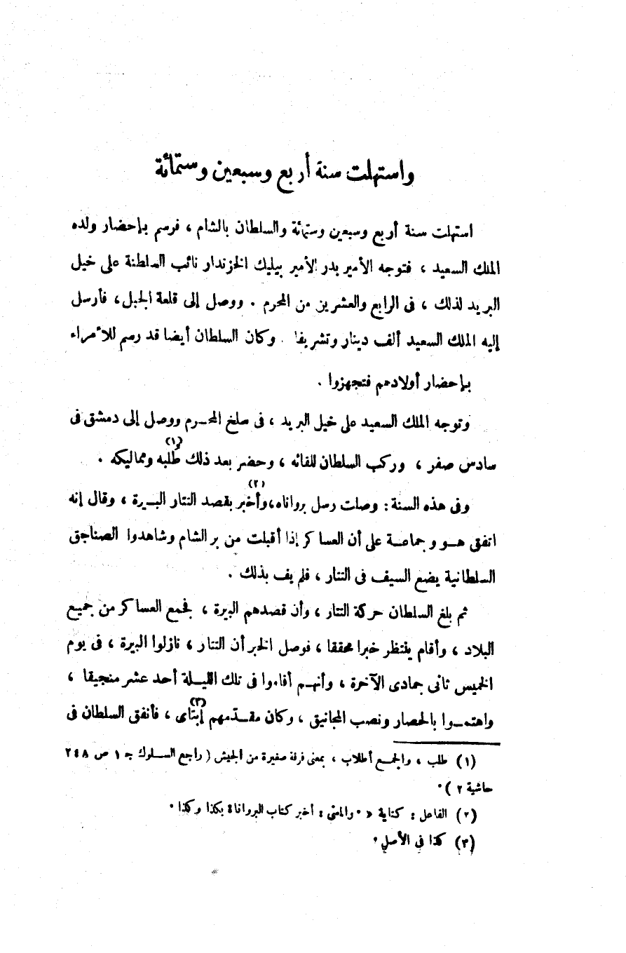 ثم بلغ السلطان حركة التتار، وأن قصدهم البيرة، فجمع العساكر من جميع البلاد، وأقام ينتظر خبرا محققا، فوصل الخبر أن التتار، نازلوا البيرة، فى يوم الخميس ثانى جمادى الآخرة، وأنهم أقاموا فى تلك الليلة أحد عشر منجيقا، واهتموا بالحصار ونصب المجانيق، وكان مقدّمهم إبتاى «3» ، فأنفق السلطان فى
