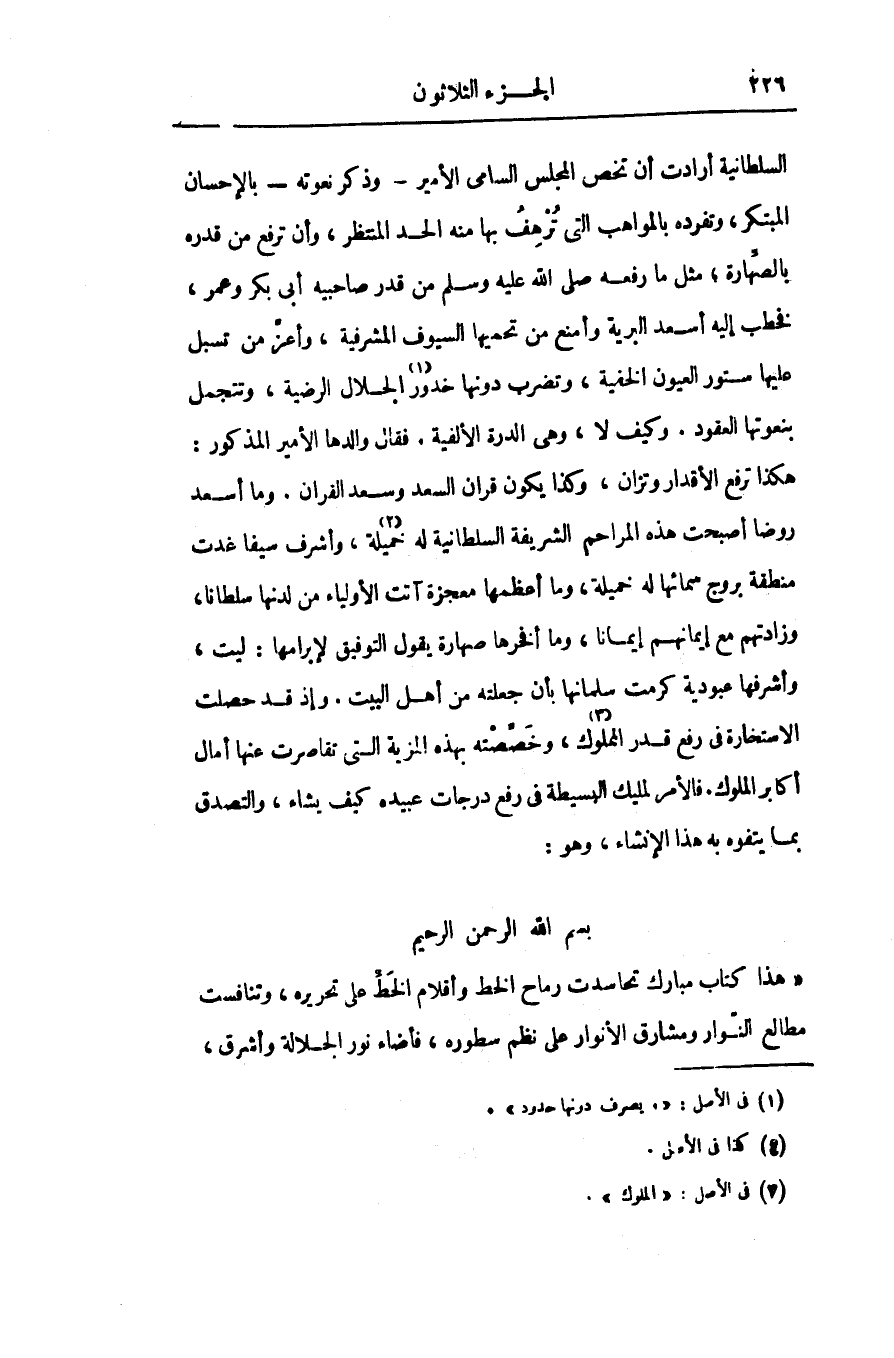 «هذا كتاب مبارك تحاسدت رماح الخط وأقلام الخطّ على تحريره، وتنافست مطالع النّوار ومشارق الأنوار على نظم سطوره، فأضاء نور الجلالة وأشرق،