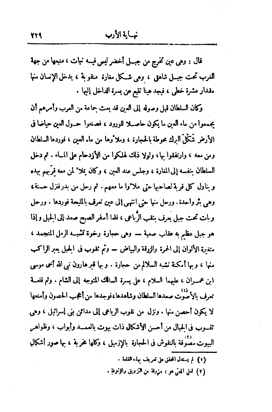 وكان السلطان قبل وصوله إلى العين قد بعث جماعة من العرب وأمرهم أن يجمعوا من ماء العين ما يكون حاصلا للورود، فصنعوا حول العين حياضا فى الأرض شكل البرك محوطة بالحجارة، وملأوها من ماء العين، فوردها السلطان ومن معه، وارتفقوا بها، ولولا ذلك لهلكوا من الأزدحام على الماء. ثم دخل السلطان بنفسه إلى المغارة، وجلس عند العين، وكان يملأ لمن معه قربهم بيده ويناول كل قربة لصاحبها حتى ملأوا ما معهم. ثم رحل من بدر فنزل حسنة، وهى بئر واحدة. ورحل منها حتى انتهى إلى عين تعرف بالمليحة فوردها. ورحل وبات تحت جبل يعرف بنقب الرّباعى، فلما أسفر الصبح صعد إلى الجبل وإذا هو جبل عظيم به عقاب صعبة- وهى حجارة رخوة تشبه الرمل المتجمد، متغيرة الألوان إلى الحمرة والزرقة والبياض- وثم ثقوب فى الجبل يعبر الراكب منها، وبها أمكنة تشبه السلالم من حجارة. وبها قبر هارون نبى الله أخى موسى ابن عمران، عليهما السلام، على يسرة السالك المتوجه إلى الشام. وثم قلعة تعرف بالأصوت «1» صعدها السلطان وشاهدها، فوجدها من أعجب الحصون وأمنعها لا يكون أحصن منها. ونزل من نقوب الرباعى إلى مدائن بنى إسرائيل، وهى ثقوب فى الجبال من أحسن الأشكال ذات بيوت بالعمد وأبواب، وظواهر البيوت مصوقة «2» بالنقوش فى الحجارة بالإزميل، وكلها مخربة، بها صور أشكال