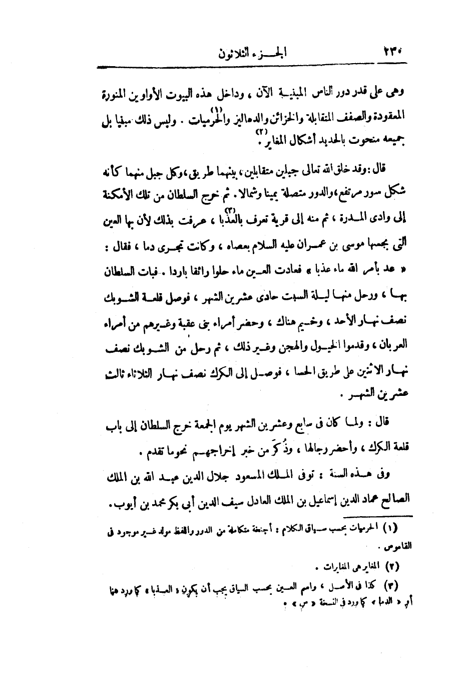 «عد بأمر الله ماء عذبا» فعادت العين ماء حلوا رائقا باردا. فبات السلطان بها، ورحل منها ليلة السبت حادى عشرين الشهر، فوصل قلعة الشوبك نصف نهار الأحد، وخيم هناك، وحضر أمراء بنى عقبة وغيرهم من أمراء العربان، وقدموا الخيول والهجن وغير ذلك، ثم رحل من الشوبك نصف نهار الاثنين على طريق الحسا، فوصل إلى الكرك نصف نهار الثلاثاء ثالث عشرين الشهر.