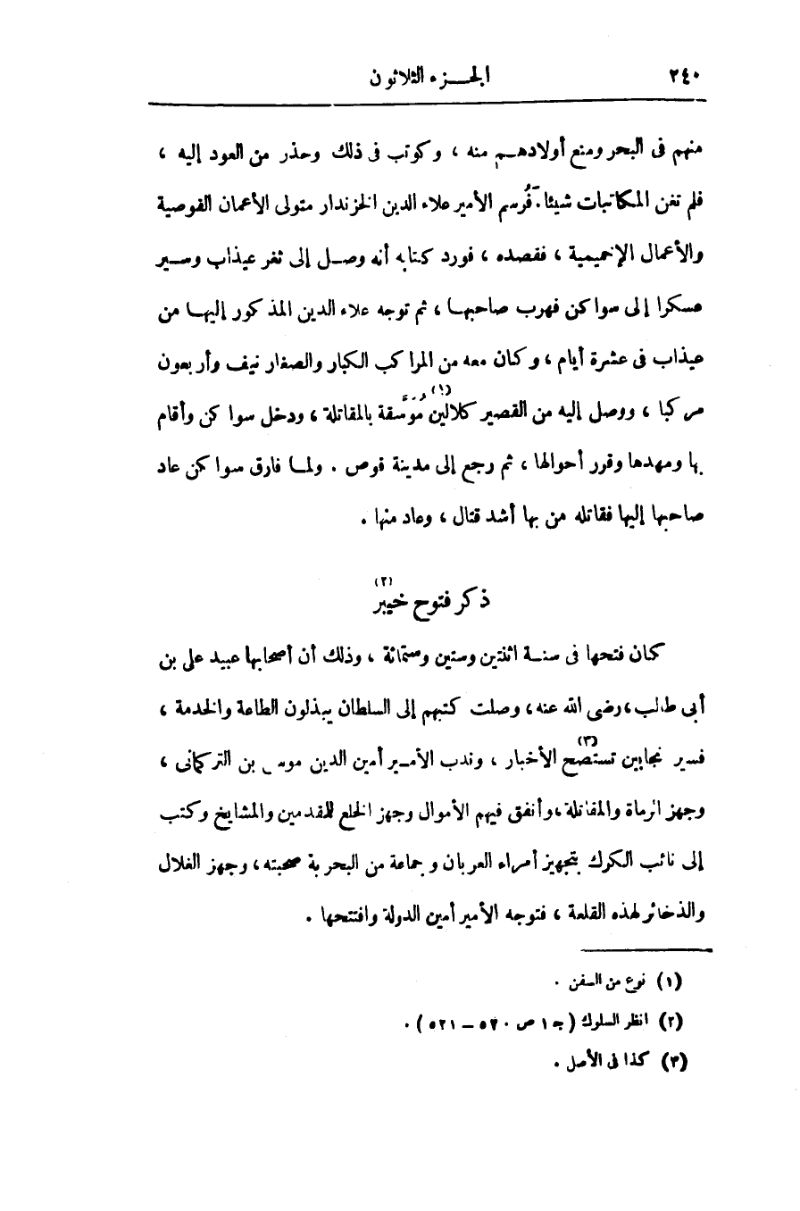 منهم فى البحر ومنع أولادهم منه، وكوتب فى ذلك وحذر من العود إليه، فلم تغن المكاتبات شيئا. فرسم الأمير علاء الدين الخزندار متولى الأعمان القوصية والأعمال الإخميمية، فقصده، فورد كتابه أنه وصل إلى ثغر عيذاب وسير عسكرا إلى سواكن فهرب صاحبها، ثم توجه علاء الدين المذكور إليها من عيذاب فى عشرة أيام، وكان معه من المراكب الكبار والصغار نيف وأربعون مركبا، ووصل إليه من القصير كلالين «1» موسّقة بالمقاتلة، ودخل سواكن وأقام بها ومهدها وقرر أحوالها، ثم رجع إلى مدينة قوص. ولما فارق سواكن عاد صاحبها إليها فقاتله من بها أشد قتال، وعاد منها.