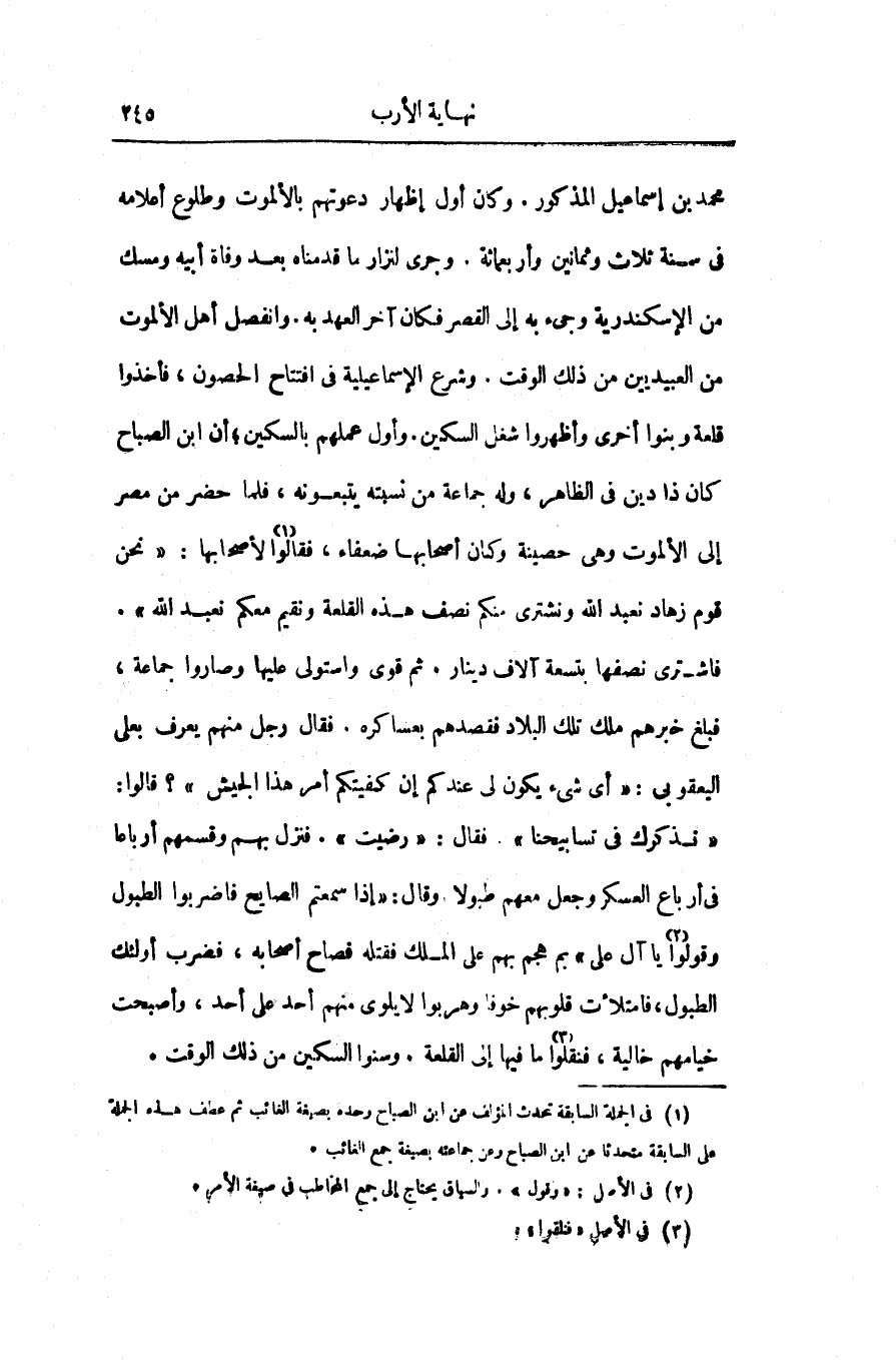 محمد بن إسماعيل المذكور. وكان أول إظهار دعوتهم بالألموت وطلوع أعلامه فى سنة ثلاث وثمانين وأربعمائة. وجرى لنزار ما قدمناه بعد وفاة أبيه ومسك من الإسكندرية وجىء به إلى القصر فكان آخر العهد به. وانفصل أهل الألموت من العبيديين من ذلك الوقت. وشرع الإسماعيلية فى افتتاح الحصون، فأخذوا قلعة وبنوا أخرى وأظهروا شغل السكين. وأول عملهم بالسكين؛ أن ابن الصباح كان ذا دين فى الظاهر، وله جماعة من نسبته يتبعونه، فلما حضر من مصر إلى الألموت وهى حصينة وكان أصحابها ضعفاء، فقالوا «1» لأصحابها: «نحن قوم زهاد نعبد الله ونشترى منكم نصف هذه القلعة ونقيم معكم نعبد الله» .