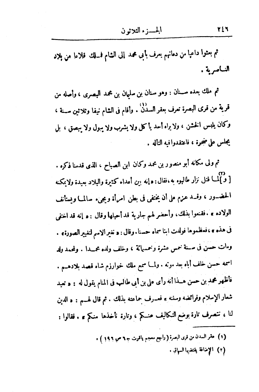 ثم ملك بعده سنان: وهو سنان بن سليمان بن محمد البصرى، وأصله من قرية من قرى البصرة تعرف بعقر السدن «1» . وأقام فى الشام نيفا وثلاثين سنة، وكان يلبس الخشن، ولا يراه أحد يأكل ولا يشرب ولا يبول ولا يبصق، بل يجلس على ضجرة، فاعتقدوا فيه التأله.