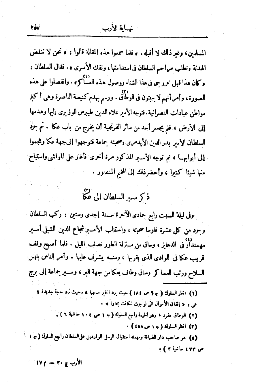 «كان هذا قبل خروجى فى هذا الشتاء ووصول هذه العساكر «1» » . وانفصلوا على هذه الصورة، وأمر أنهم لا يبيتون فى الوطاق «2» . ورسم بهدم كنيسة الناصرة وهى أكبر مواطن عبادات النصرانية. فتوجه الأمير علاء الدين طيبرس الوزيرى إليها وهدمها إلى الأرض، فلم يجسر أحد من سائر الفرنجية أن يخرج من باب عكا. ثم جرد السلطان الأمير بدر الدين الأيدمرى وصحبته جماعة فتوجهوا إلى جهة عكا وهجموا إلى أبوابها، ثم توجه الأمير المذكور مرة أخرى فأغار على المواشى واستباح منها شيئا كثيرا، وأحضر ذلك إلى المخيم المنصور.