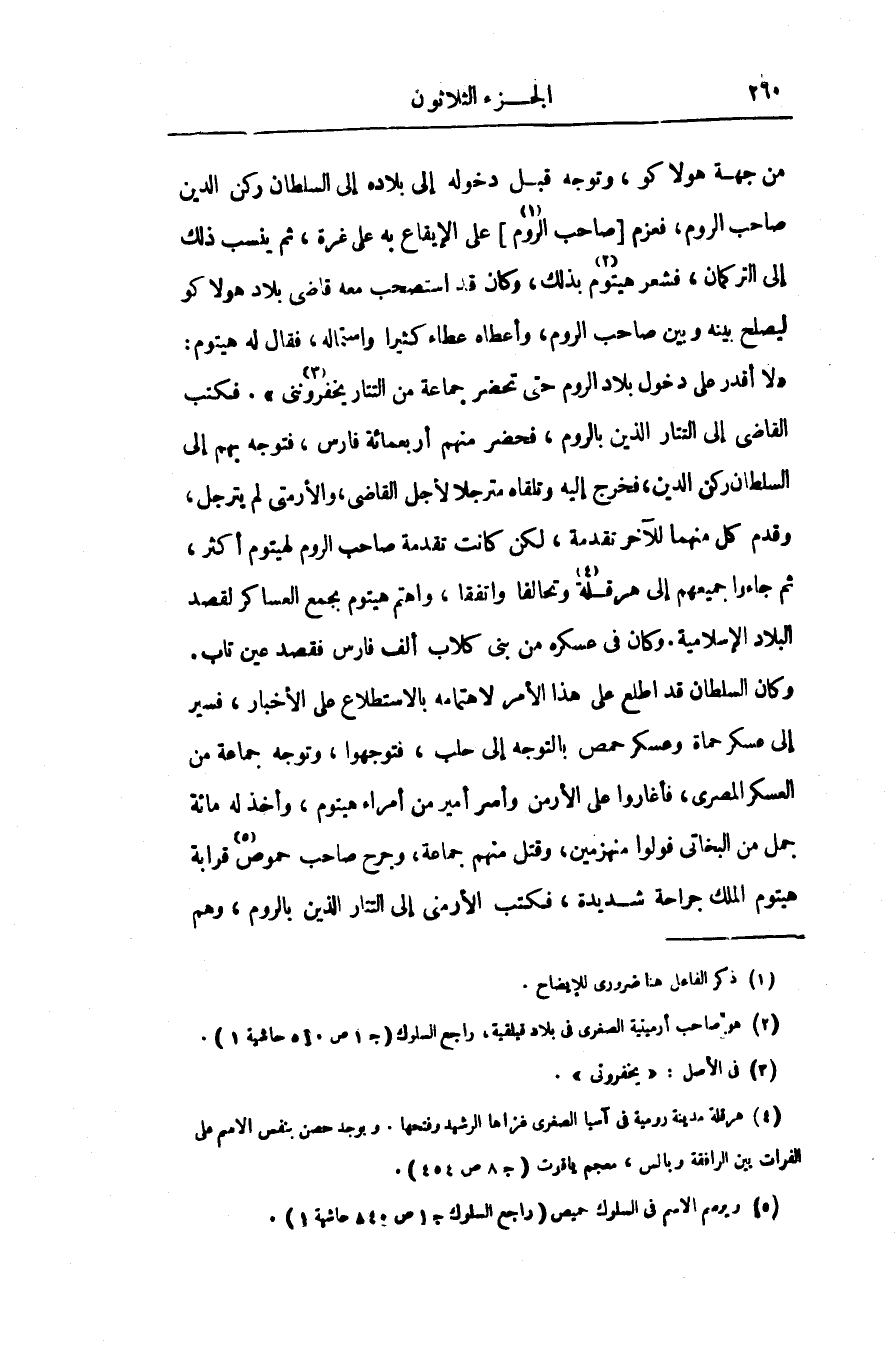وكان السلطان قد اطلع على هذا الأمر لاهتمامه بالاستطلاع على الأخبار، فسير إلى عسكر حماة وعسكر حمص بالتوجه إلى حلب، فتوجهوا، وتوجه جماعة من العسكر المصرى، فأغاروا على الأرمن وأسر أمير من أمراء هيتوم، وأخذ له مائة جمل من البخاتى فولوا منهزمين، وقتل منهم جماعة، وجرح صاحب حموص «5» قرابة هيتوم الملك جراحة شديدة، فكتب الأرمنى إلى التتار الذين بالروم، وهم