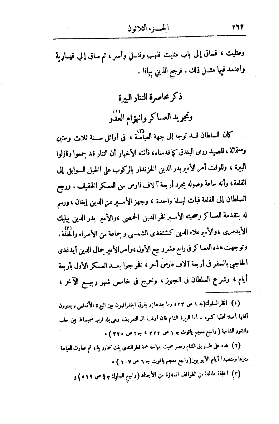 كان السلطان قد توجه إلى جهة العباسة «2» ، فى أوائل سنة ثلاث وستين وستمائة، للصيد ورمى البندق كما قدمناه، فأتته الأخبار أن التتار قد جمعوا ونازلوا البيرة، وللوقت أمر الأمير بدر الدين الخزندار بالركوب على الخيل السوابق إلى القلعة، وأنه ساعة وصوله يجرد أربعة آلاف فارس من العسكر الخفيف. ورجع السلطان إلى القلعة فبات ليلة واحدة، وجهز الأمير عز الدين إيغان، ورسم له بتقدمة العساكر وصحبته الأمير فخر الدين الحمصى، والأمير بدر الدين بيليك الأيدمرى، والأمير علاء الدين كشتغدى الشمسى وجماعة من الأمراء والحلقة «3» .