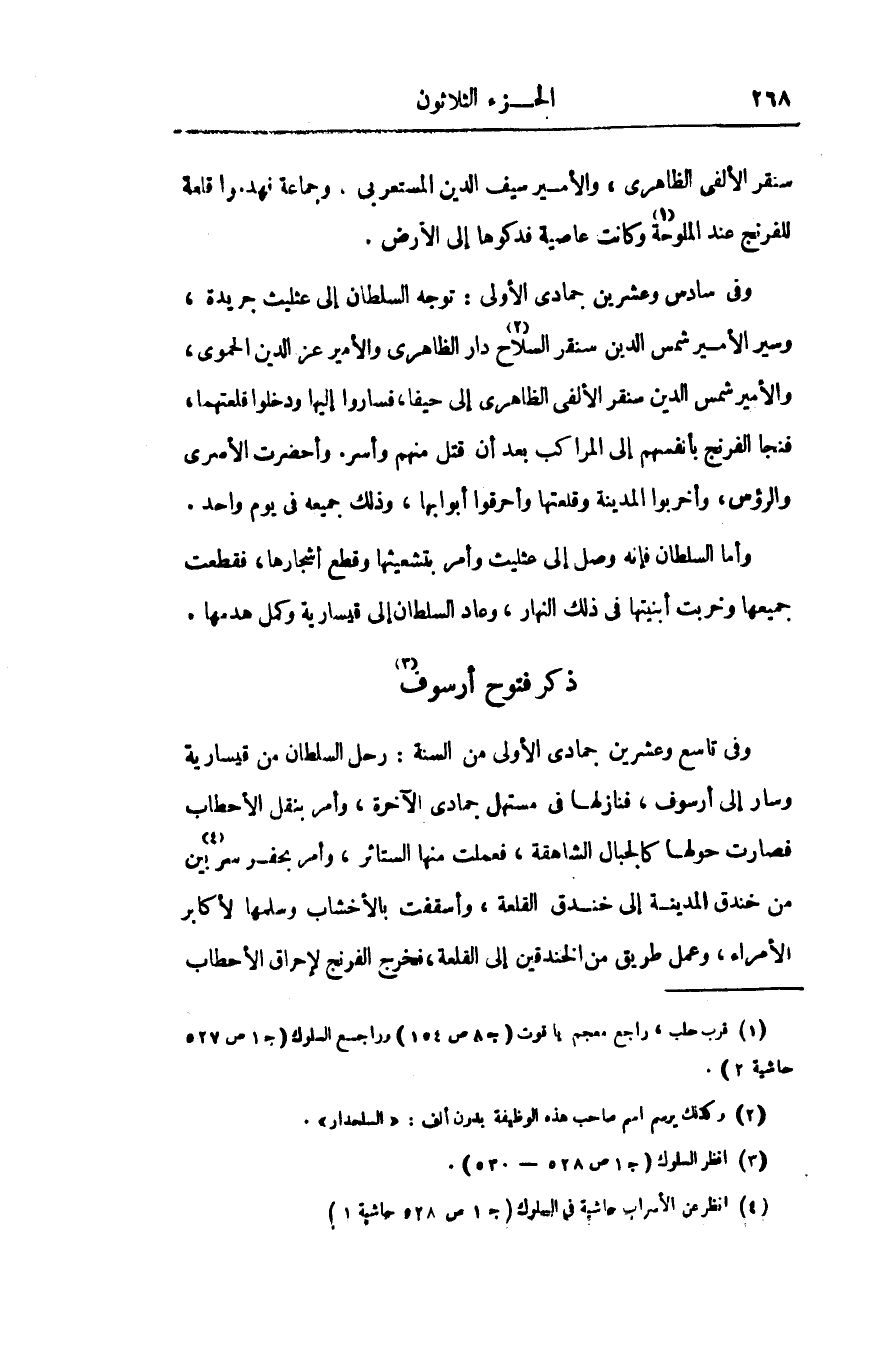 وفى تاسع وعشرين جمادى الأولى من السنة: رحل السلطان من قيسارية وسار إلى أرسوف، فنازلها فى مستهل جمادى الآخرة، وأمر بنقل الأحطاب فصارت حولها كالجبال الشاهقة، فعملت منها الستائر، وأمر بحفر سربين «4» من خندق المدينة الى خندق القلعة، وأسقفت بالأخشاب وسلمها لأكابر الأمراء، وعمل طريق من الخندقين إلى القلعة، فخرج الفرنج لإحراق الأحطاب