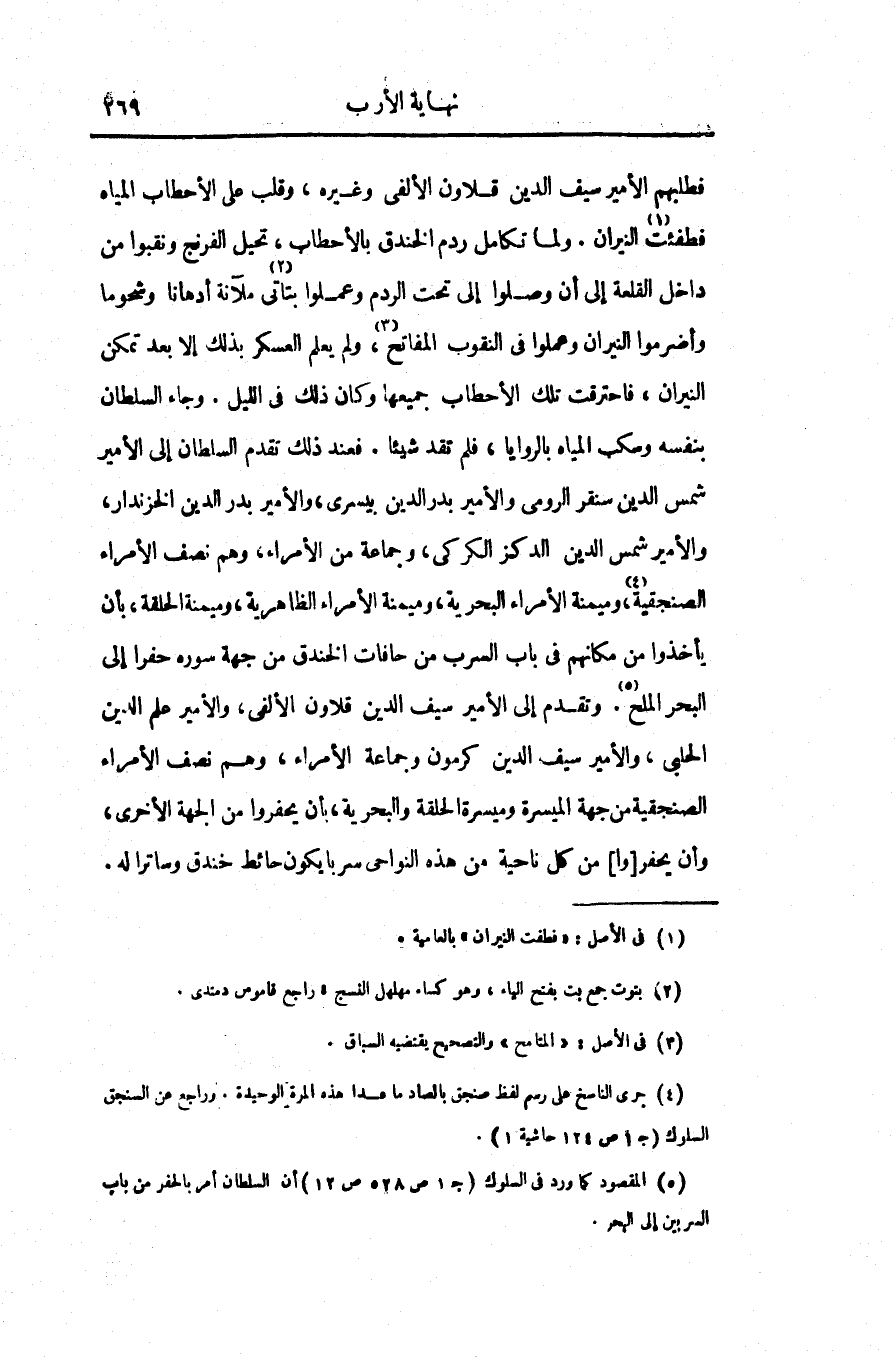 فطلبهم الأمير سيف الدين قلاون الألفى وغيره، وقلب على الأحطاب المياه فطفئت «1» النيران. ولما تكامل ردم الخندق بالأحطاب، تحيل الفرنج ونقبوا من داخل القلعة إلى أن وصلوا إلى تحت الردم وعملوا بتاتى «2» ملآنة أدهانا وشحوما وأضرموا النيران وعملوا فى النقوب المفاتح «3» ، ولم يعلم العسكر بذلك إلا بعد تمكن النيران، فاحترقت تلك الأحطاب جميعها وكان ذلك فى الليل. وجاء السلطان بنفسه وسكب المياه بالروايا، فلم تقد شيئا. فعند ذلك تقدم السلطان إلى الأمير شمس الدين سنقر الرومى والأمير بدر الدين بيسرى، والأمير بدر الدين الخزندار، والأمير شمس الدين الدكز الكركى، وجماعة من الأمراء، وهم نصف الأمراء الصنجقية «4» ، وميمنة الأمراء البحرية، وميمنة الأمراء الظاهرية، وميمنة الحلقة، بأن يأخذوا من مكانهم فى باب السرب من حافات الخندق من جهة سوره حفرا إلى البحر الملح «5» . وتقدم إلى الأمير سيف الدين قلاون الألفى، والأمير علم الدين الحلبى، والأمير سيف الدين كرمون وجماعة الأمراء، وهم نصف الأمراء الصنجقية من جهة الميسرة وميسرة الحلقة والبحرية، بأن يحفروا من الجهة الأخرى، وأن يحفر [وا] من كل ناحية من هذه النواحى سربا يكون حائط خندق وساترا له.