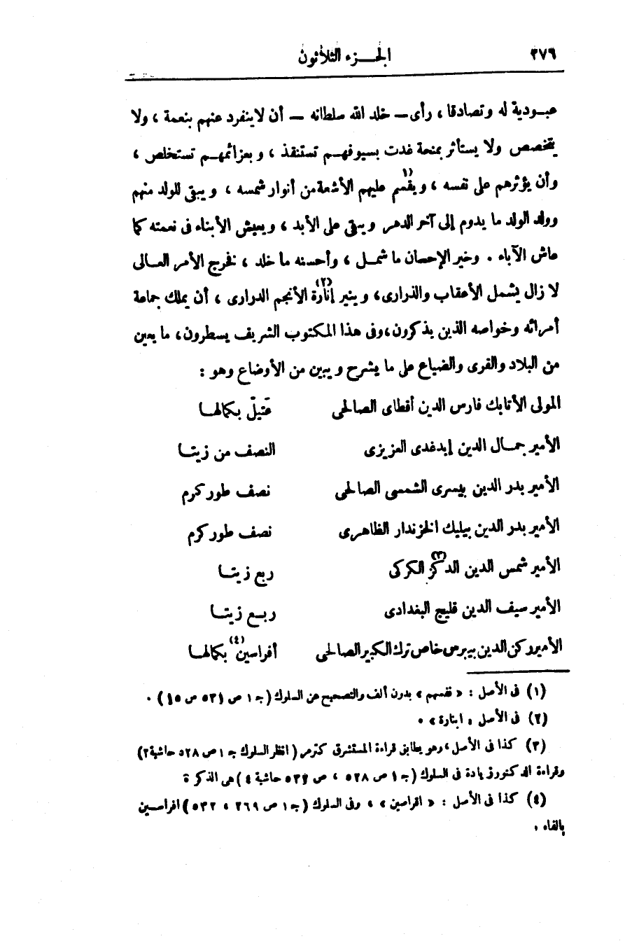 المولى الأتابك فارس الدين أقطاى الصالحى* عتيل بكمالها الأمير جمال الدين إيدغدى العزيزى النصف من زيتا الأمير بدر الدين بيسرى الشمسى الصالحى نصف طور كرم الأمير بدر الدين بيليك الخزندار الظاهرى نصف طور كرم الأمير شمس الدين الدكز «3» الكركى ربع زيتا الأمير سيف الدين قليج البغدادى ربع زيتا الأمير ركن الدين بيبرس خاص ترك الكبير الصالحى أفراسين «4» بكمالها