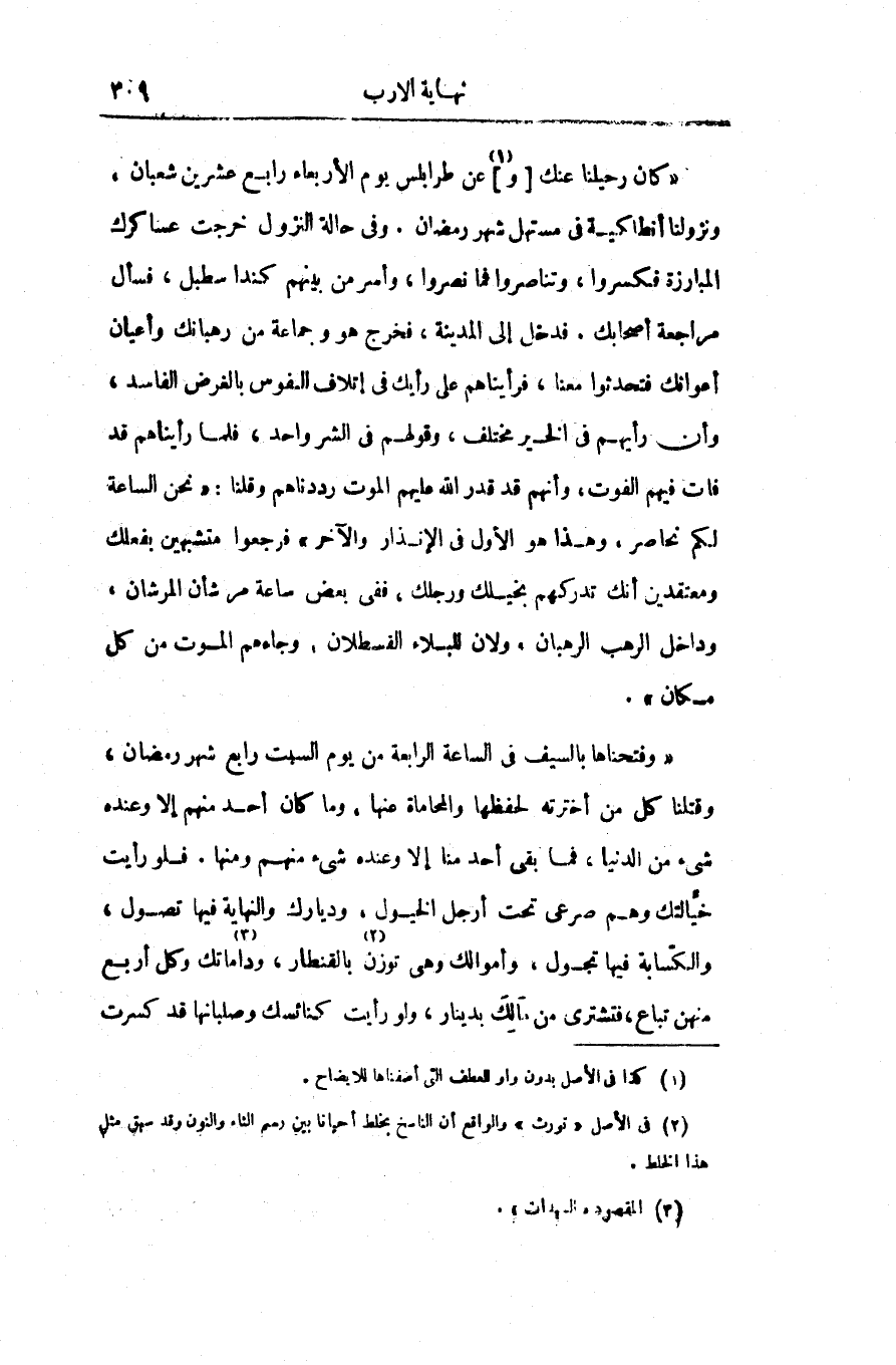 «وفتحناها بالسيف فى الساعة الرابعة من يوم السبت رابع شهر رمضان، وقتلنا كل من أخترته لحفظها والمحاماة عنها، وما كان أحد منهم إلا وعنده شىء من الدنيا، فما بقى أحد منا إلا وعنده شىء منهم ومنها. فلو رأيت خيّالتك وهم صرعى تحت أرجل الخيول، وديارك والنهاية فيها تصول، والكسّابة فيها تجول، وأموالك وهى توزن «2» بالقنطار، وداماتك «3» وكل أربع منهن تباع، فتشترى من مالك بدينار، ولو رأيت كنائسك وصلبانها قد كسرت